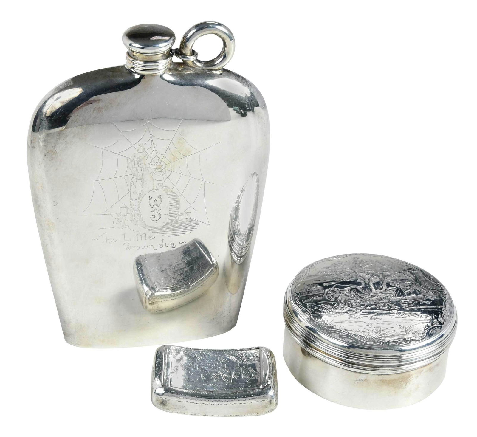 Lot of sterling silver dresser accessories, including various covered glass jars and scent bottles.Mar 01, 2026GROUP LOT OF SILVER ITEMSFeb 25, 2026Three silver cigarette boxes,Two Sterling Desk Articles5 days LeftA silver cigarette box, Birmingham, 1944Four Sterling Table Articles Including a Wine Coaster and Others5 days LeftThree Glass and French Silver Dresser Jars, Bush Family ProvenanceFeb 25, 2026THREE SILVER MOUNTED TABLE BOXES2 days LeftIrish silver hip flask & English bougie box4 days LeftFour pieces of Chinese export 950- silver overlaid table articles5 days LeftEngland circa 1750 A George II unmarked silver table double snuff box3 days LeftA silver seal box writing desk companion Asprey & Co Ltd, London 1920A silver hip flask,A GROUP OF ENGLISH SILVER BOXES, 112gFeb 25, 2026Three silver cigarette cases,A Group of Sterling Silver Table Articles29 mins Left