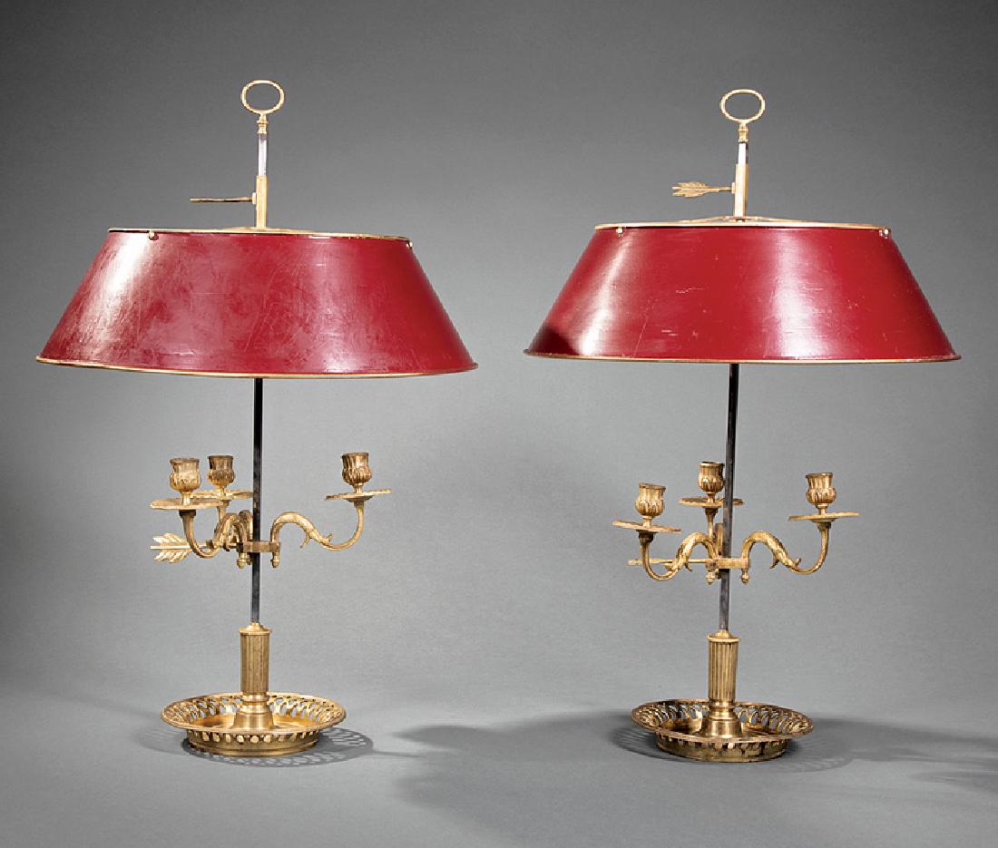 ![Two Paint-Decorated Tole [Bouillotte]: Table Lamps French, 20th century, the first with circular painted shade with sphinx and scrolling vine decoration, adjustable post with three candle-form lights, drilled and electrified, 20-1/2 in., [](https://p1.liveauctioneers.com/33/49276/22939834_1_x.jpg?height=280&quality=70&sharpen=true&version=1387461589&width=280)