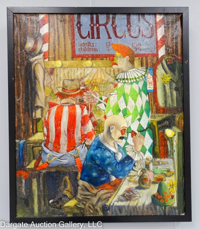![BERT RUBEN MULLINS CLOWNS OIL ON CANVAS: Bert Ruben Mullins (American, 1901-1963) 1963 oil on canvas painting depicting clowns perparing for a circus / signed lower right [MULLINS 63] / set in black wood framef / Visible Art Size: 24"H x 19.](https://p1.liveauctioneers.com/49/352603/192609342_1_x.jpg?height=280&quality=70&sharpen=true&version=1732396814&width=280)