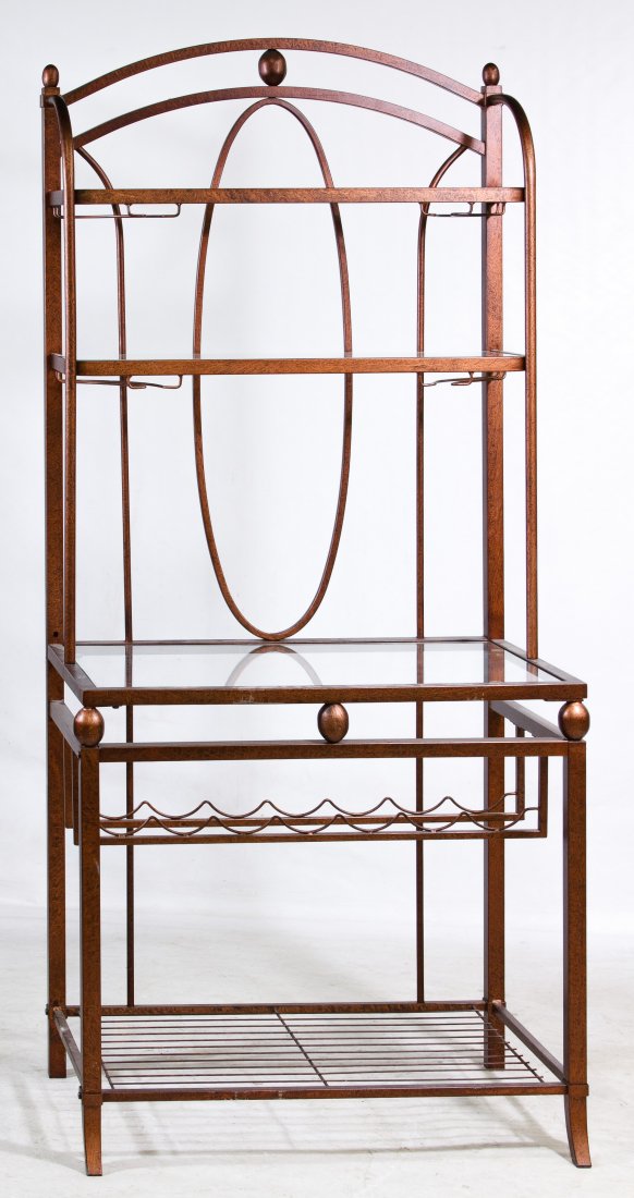 ![French Iron Corner Baker's Rack: French wrought iron corner baker's rack, painted yellow in 4 tiers, with brass mounts and brass plated tier edges. [72" H x 19" radius]. Sturdy, needs cleaning or repainting.](https://p1.liveauctioneers.com/dist/images/placeholder.jpg?height=310&quality=70)