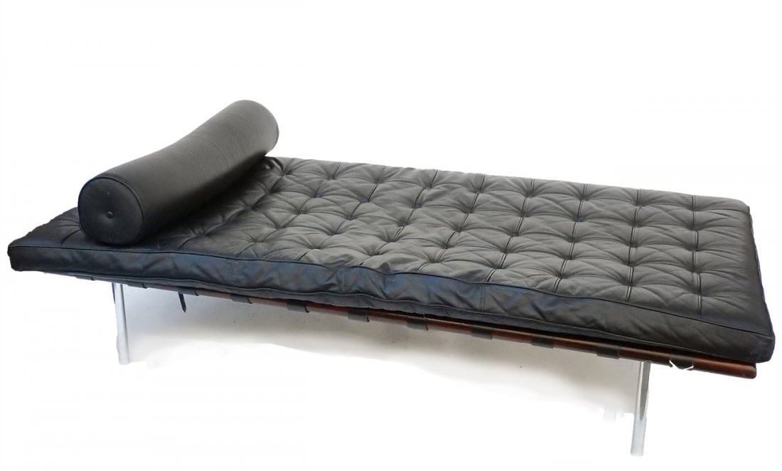 ![After Mies Van Der Rohe Couch: Barcelona couch / daybed. Chrome and stained walnut day bed. Rectangular tufted black leather upholstery. Stamped "Alivar" on bottom. [Overall: 16" x 40" x 78" W.] Light wear with some scuffs on frame](https://p1.liveauctioneers.com/1221/69997/36390355_1_x.jpg?height=280&quality=70&sharpen=true&version=1429981229&width=280)
