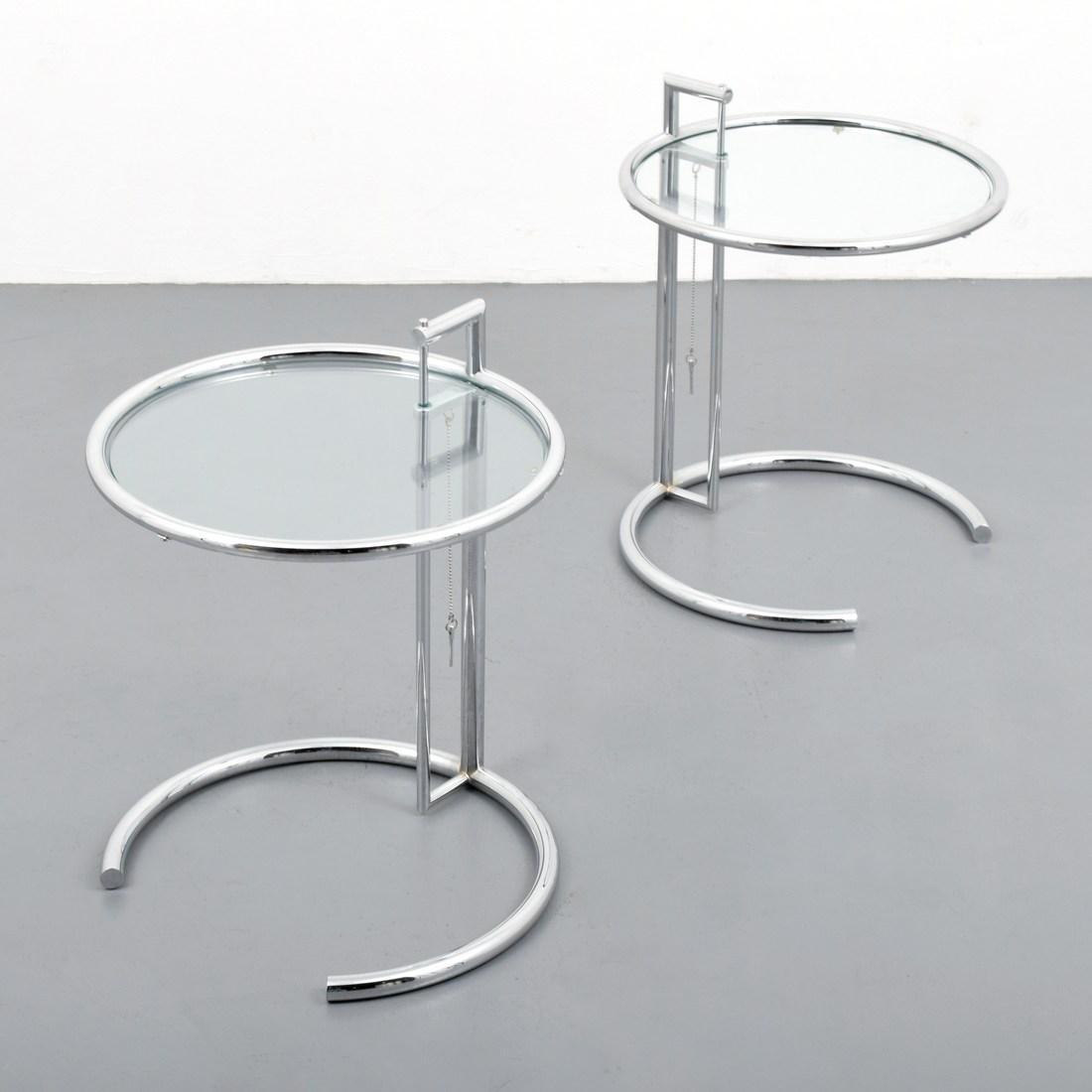 ![Pair of Eileen Gray Tables: Two chrome silver-finish round tables with smoked glass tops. [20 1/2" Dia x 24 1/2" H]. In good condition.](https://p1.liveauctioneers.com/1221/73831/38376641_1_x.jpg?height=280&quality=70&sharpen=true&version=1434487859&width=280)