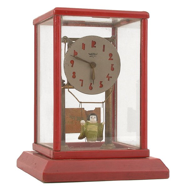 ![[CLOCKS] Junghans Kangaroo Mystery Clock Copy: After Junghans (1861-present) Kangaroo Mystery Clock Brass, wood c. 20th century Overall 11 1/2 x 12 1/2 x 3 5/8 in., pendulum 9 1/2 x 2 1/4, kangaroo 10 x 3 5/8 x 9 3/4 in A faithful reproduction of](https://p1.liveauctioneers.com/7226/405784/225354101_1_x.jpg?height=310&quality=70&version=1770309714)