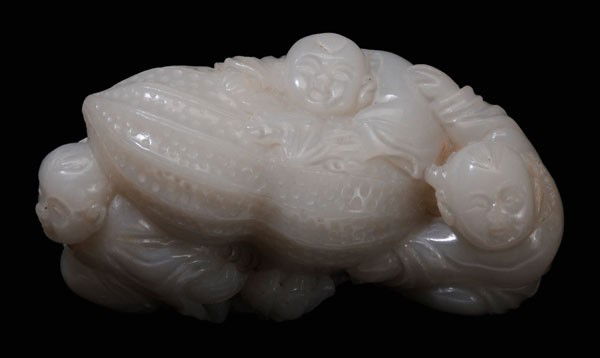 ![Jade Figural Group: Qing Dynasty, white [Xinjiang] jade with opaque white inclusions, natural fissures, two boys holding a gigantic peanut, a third boy with his arms across the top of the peanut holding a bat by its wing](https://p1.liveauctioneers.com/33/23508/8342398_1_x.jpg?height=280&quality=70&sharpen=true&width=280)