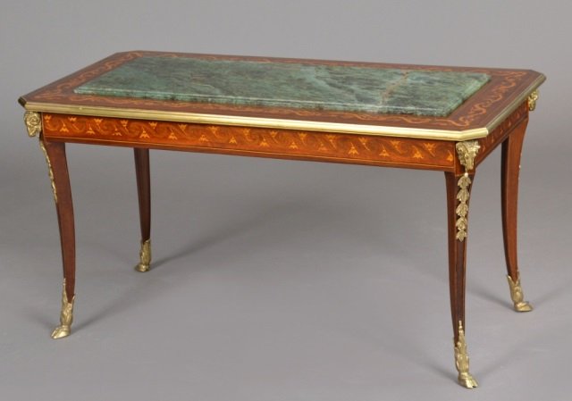 ![Marble Top Coffee Table: Fruitwood rectangular frame with inset white marble top. Some surface scratches. [29 1/4" w x 21 1/4" d x 18" h].](https://p1.liveauctioneers.com/1221/46753/21568251_1_x.jpg?height=280&quality=70&sharpen=true&version=1382473751&width=280)