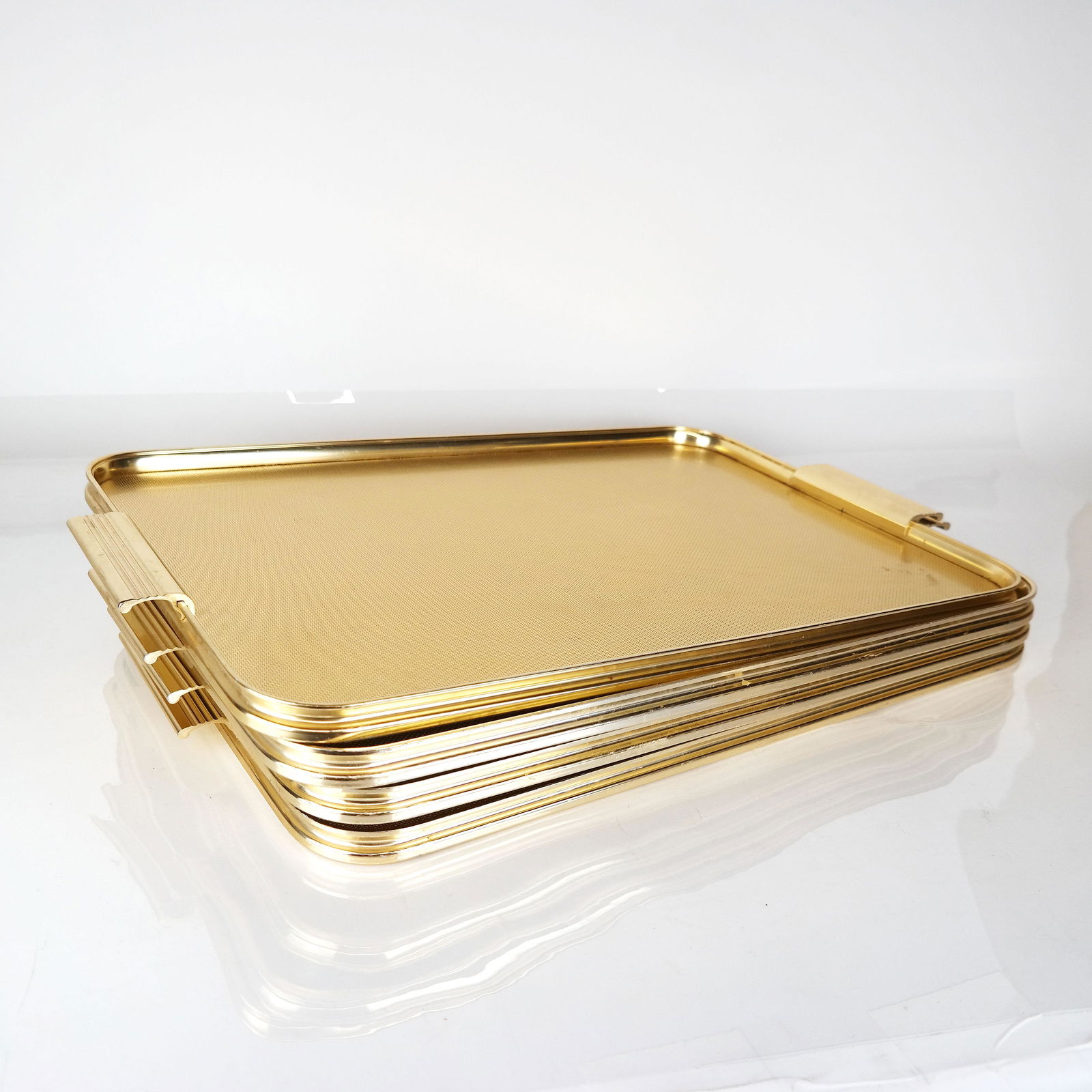![Four English Woodmet Bar Trays: Four Woodmet gold-tone anodized aluminum two-handled bar trays, made in England. [22 1/2" x 14 1/4"]. One with scratches on bottom.](https://p1.liveauctioneers.com/1221/236041/122304727_1_x.jpg?height=280&quality=70&sharpen=true&version=1644272460&width=280)