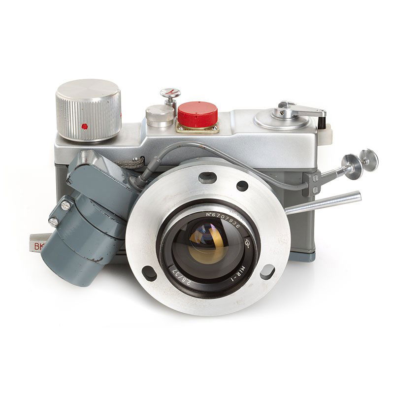 Shutter 1/140 and B., negative format 20 (24) x 36 mm, the design of the negative window is uncommon and obviously was shaped to accommodate a round object (the Moon). All armatures are sturdily built for use with hand-gloves. Mechanical and electric release (direct or remote). Connection to the on-board electrics by a special 19-pole plug. The diaphragm is operated by a substantial lever on the left side of the lens that has three positions: down (fully illuminated moon ï¾– f/11), level (half ways lit moon, f/5,6) and up (light at the moon terminator, f/2,8); schematic explanation on a plate on the hinged camera back. Behind the MIR-1 wide angle lens a special flap is mounted that only moves laterally while the release is pressed. It prevents a burn of the shutter fabric if the camera points towards the sun accidentally. only very few cameras are known to exist - first time ever offered in auction !