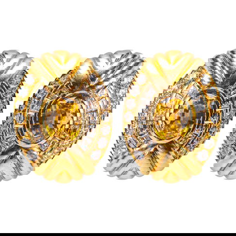 French 18 Karat Yellow Gold, Yellow Sapphire, and Diamond Ear ClipsSophisticated and luminous, this pair of French ear clips feature glowing oval yellow sapphires (approx. 5.00–6.00 carats total) framed by rows of brilliant-cut and baguette diamonds weighing approximately 3.50 carats total. Expertly crafted in 18 karat yellow gold, the design evokes sculptural ribbon motifs with layered contours and exceptional hand finishing.The radiant interplay of gold, diamond, and yellow sapphire exemplifies the timeless elegance of French jewelry houses such as M. Gérard, Boucheron, and Van Cleef & Arpels, merging color, craftsmanship, and sculptural form in perfect proportion.Condition ReportExcellent overall, minimal surface wear. Diamonds bright and well-matched; sapphires of vivid golden-yellow color with fine brilliance.