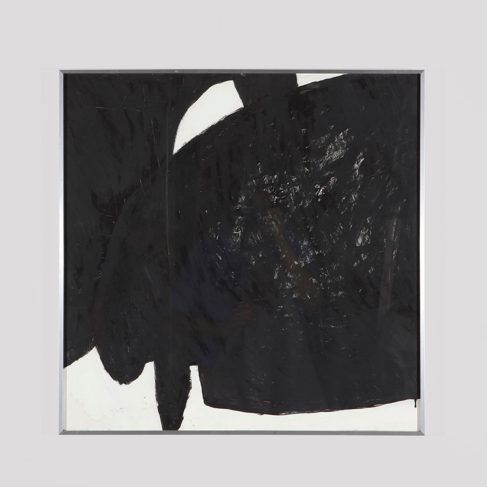 Dynamic abstract work dominated by sweeping black forms over a white background, with high contrast and graphic intensity. A poetic evocation of imagined travel. Signed. Height: 28 in. Width: 28 in.