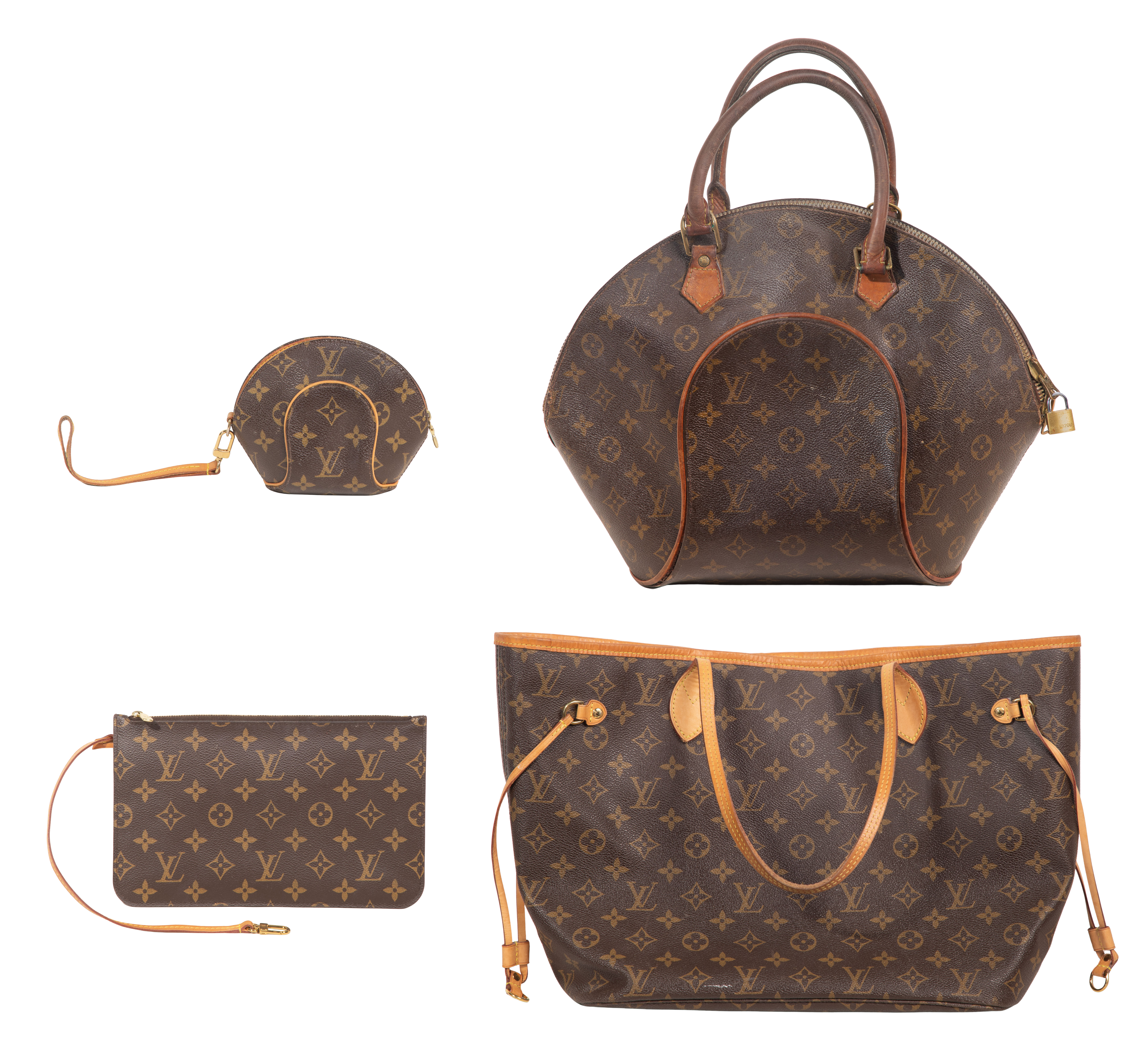 (4) items including an Ellipse handbag, a Mini Ellipse wristlet clutch, a Neverfull tote bag and a Neverfull pochette, all brown monogram canvas having cowhide trim and brass fittings, the Neverfull bag and pochette having fabric lining, all but the Ellipse handbag having leather labels inside