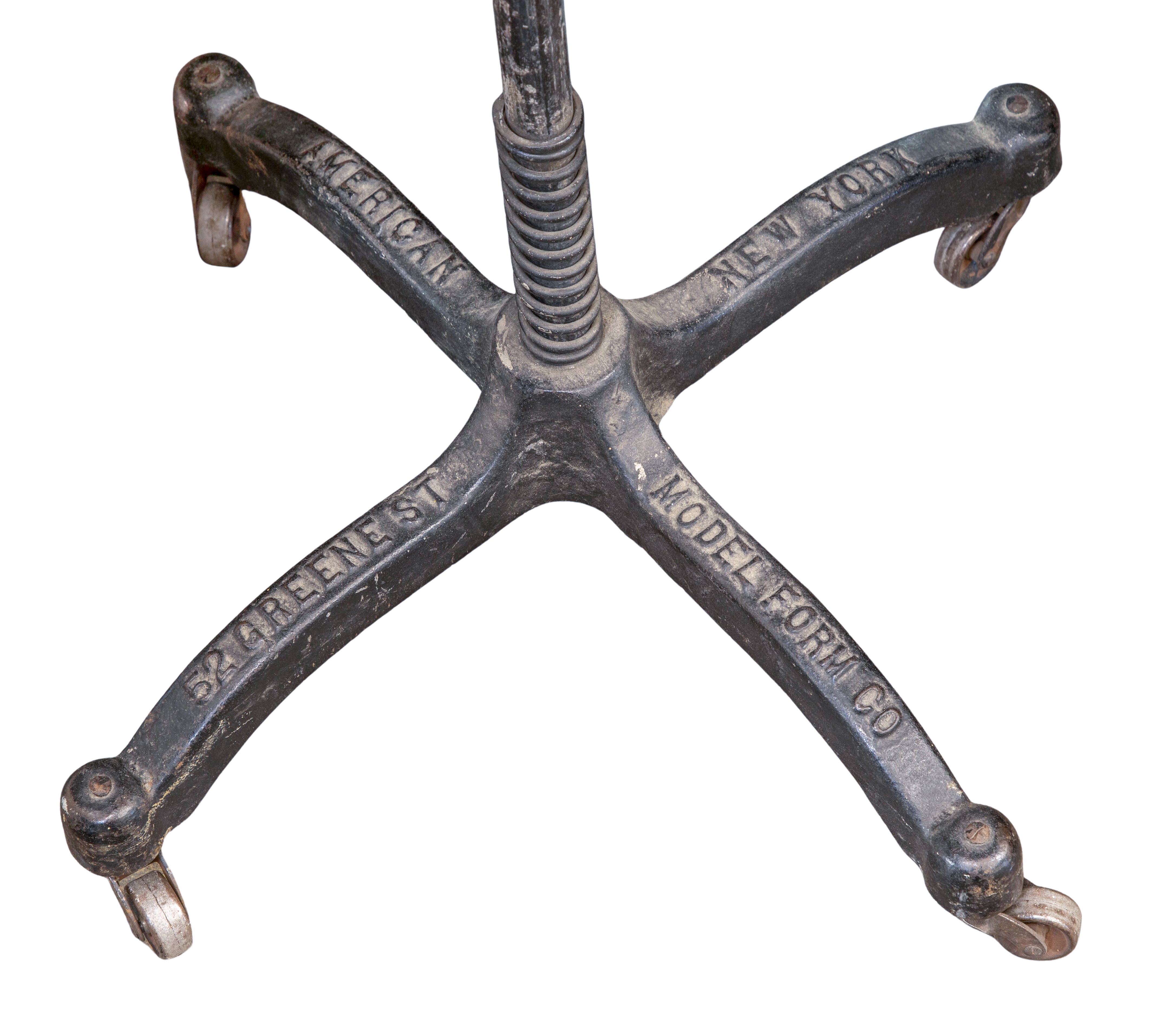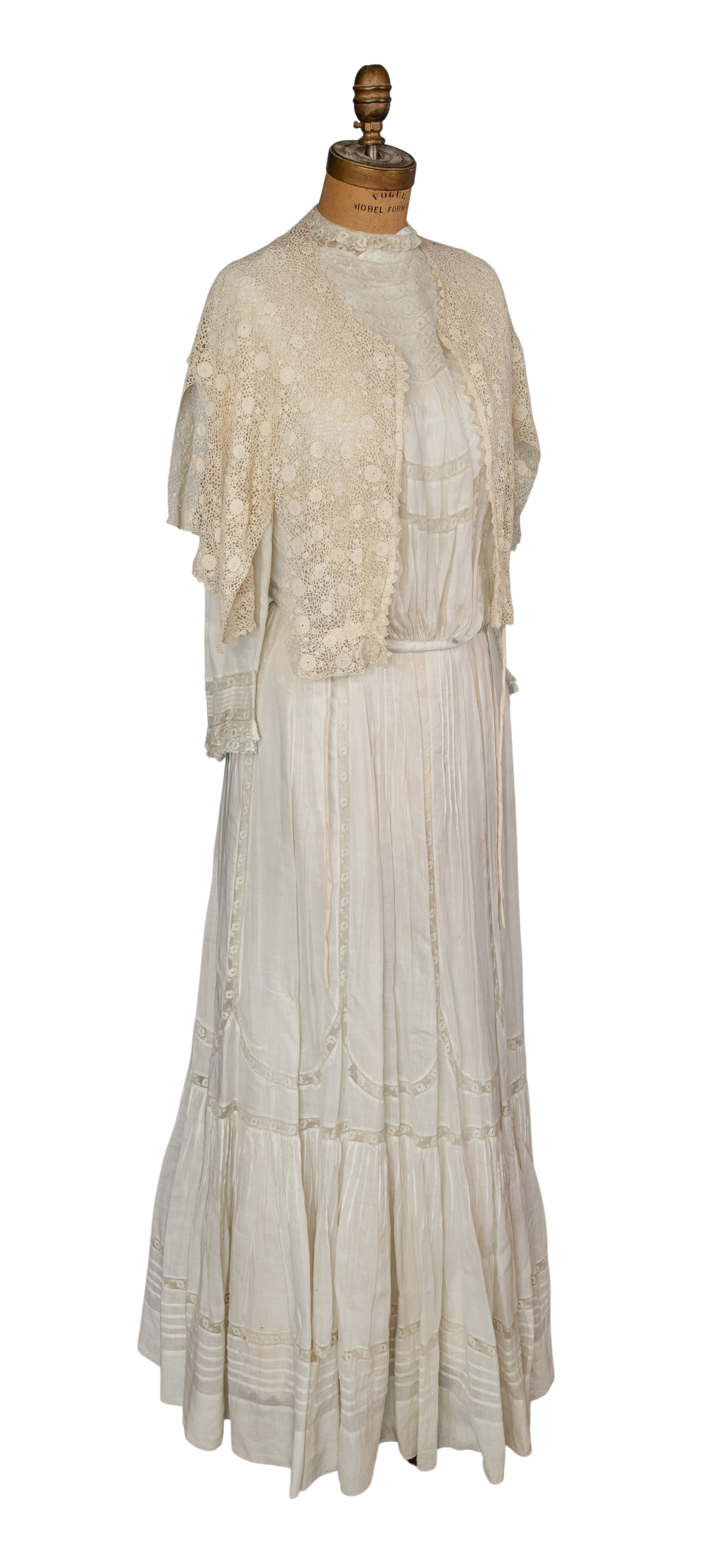 A dress form mannequin having a fabric-covered torso, cast iron base and casters, marked 'American Model Form Co' and 'Vogue' as well as a white Edwardian linen lawn dress and lace coverlet cardigan