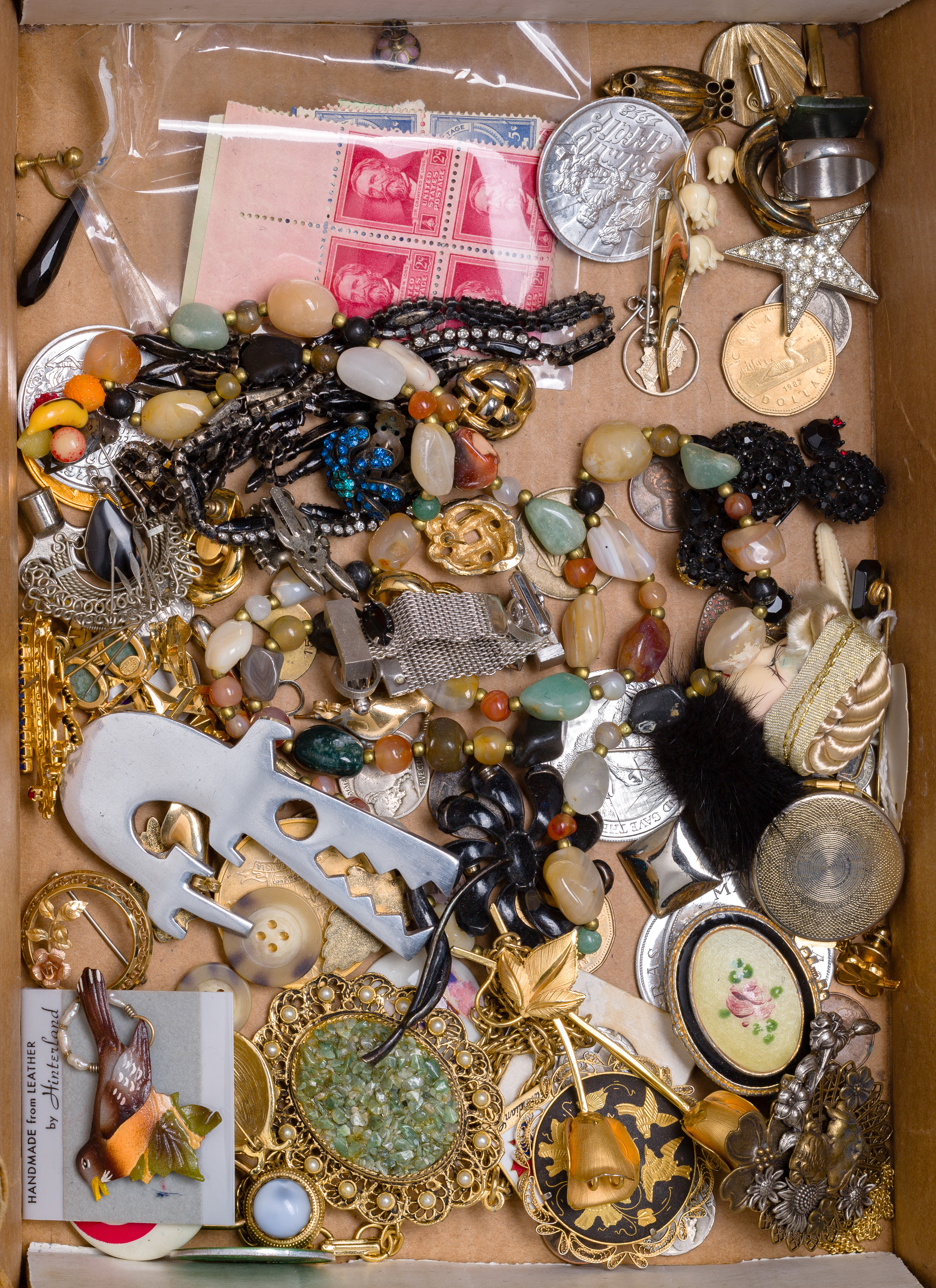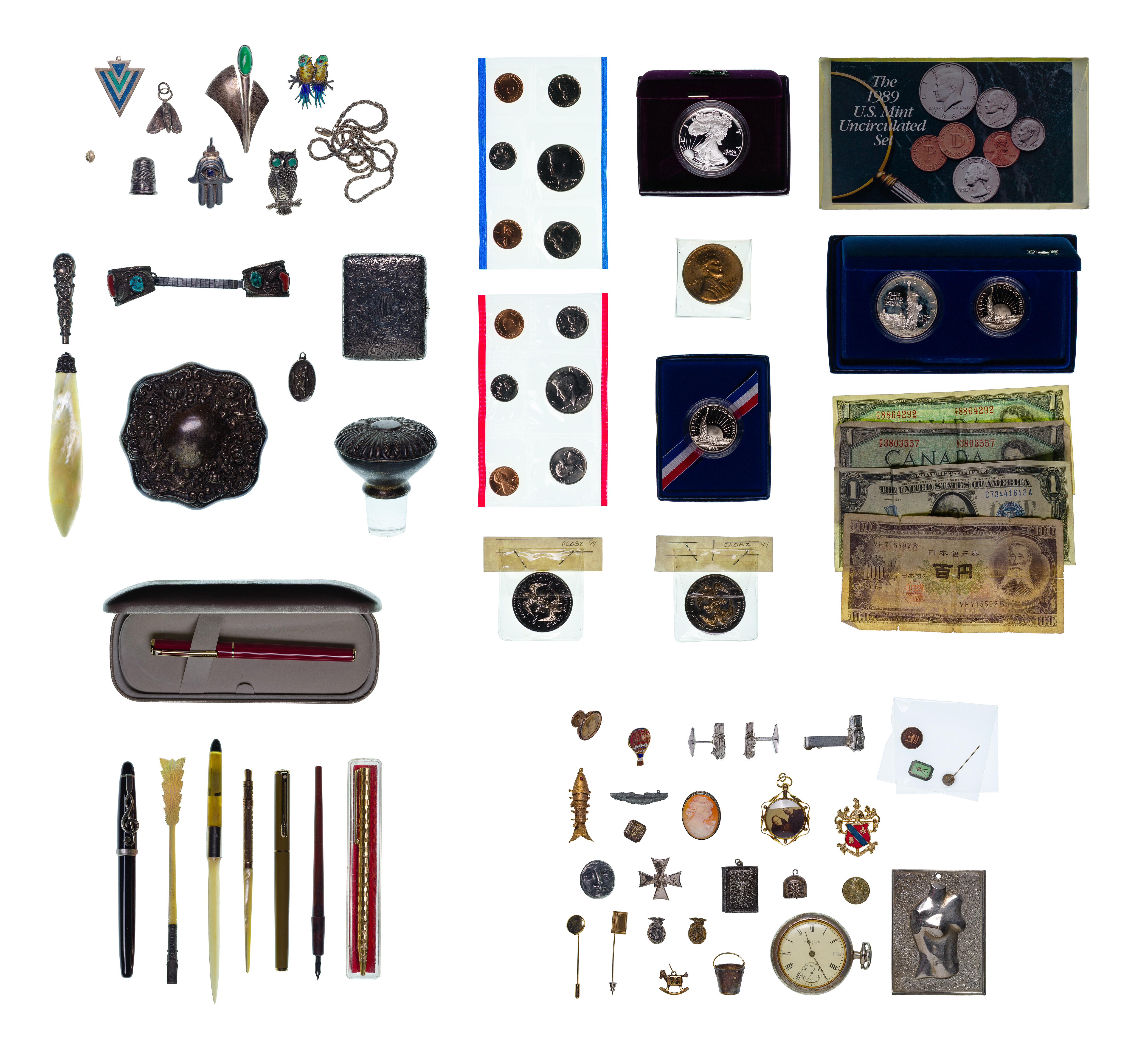 Including a dental inlay (unmarked 18k), a necklace, pins, bracelets, pendants and fragments (most marked '925' / 'sterling') as well as paper currency, coins, pens, medallions and fashion jewelry