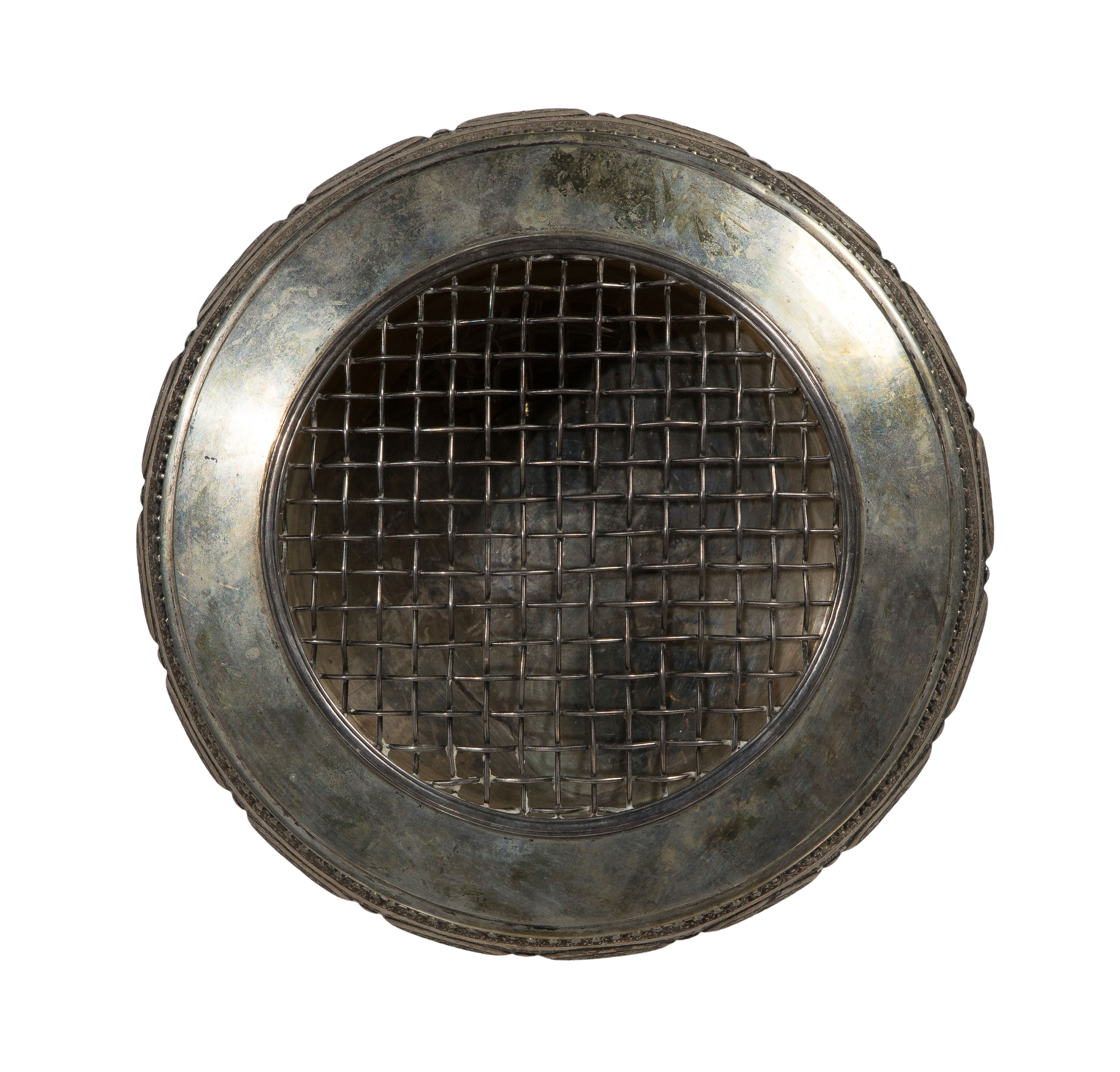 An engraved bowl having a removable grid lid (marked '84' and foreign marks)