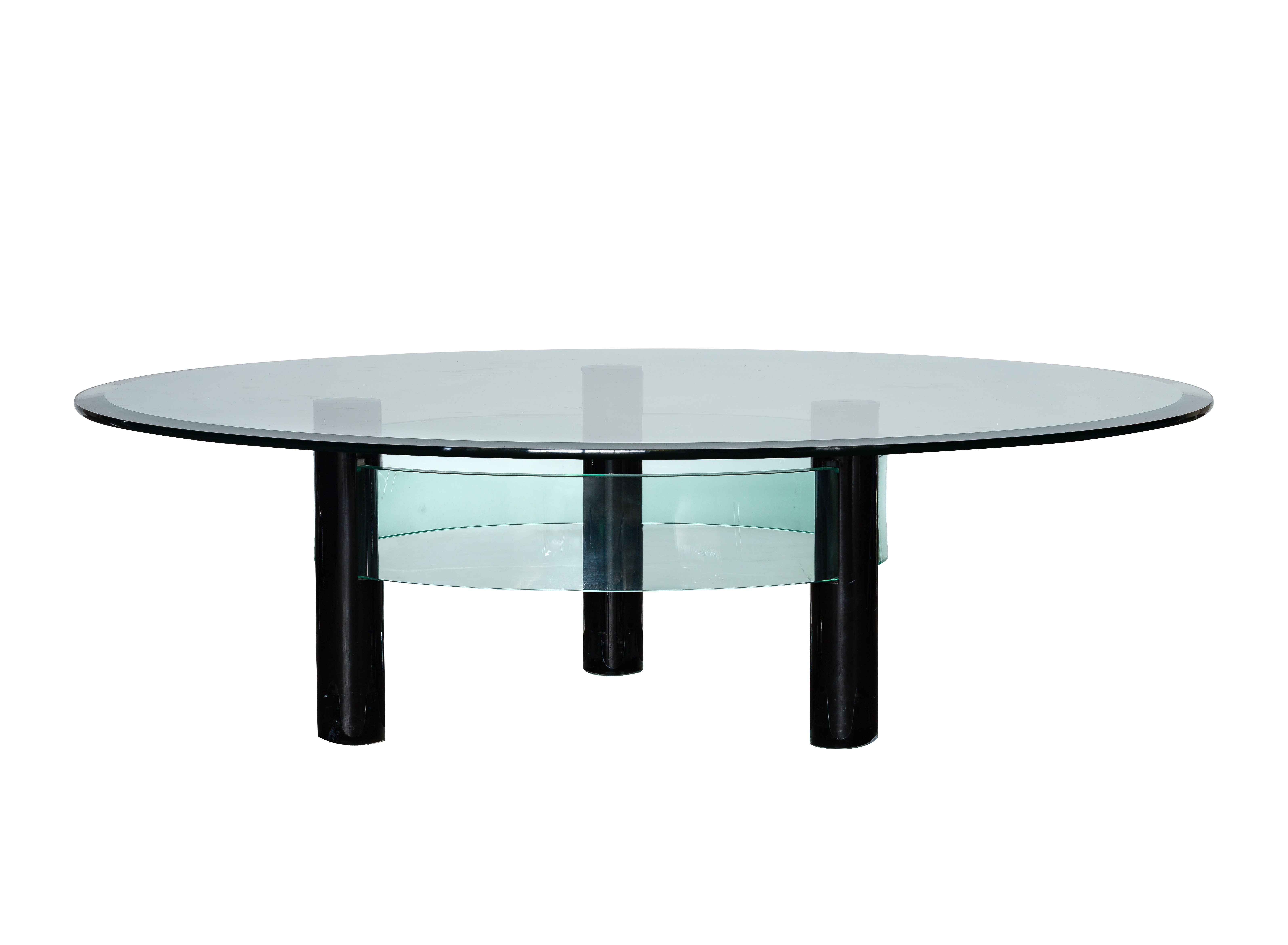 Having a beveled edge round glass top supported on three cylindrical legs having curved glass stretchers forming a circle concentric to the top