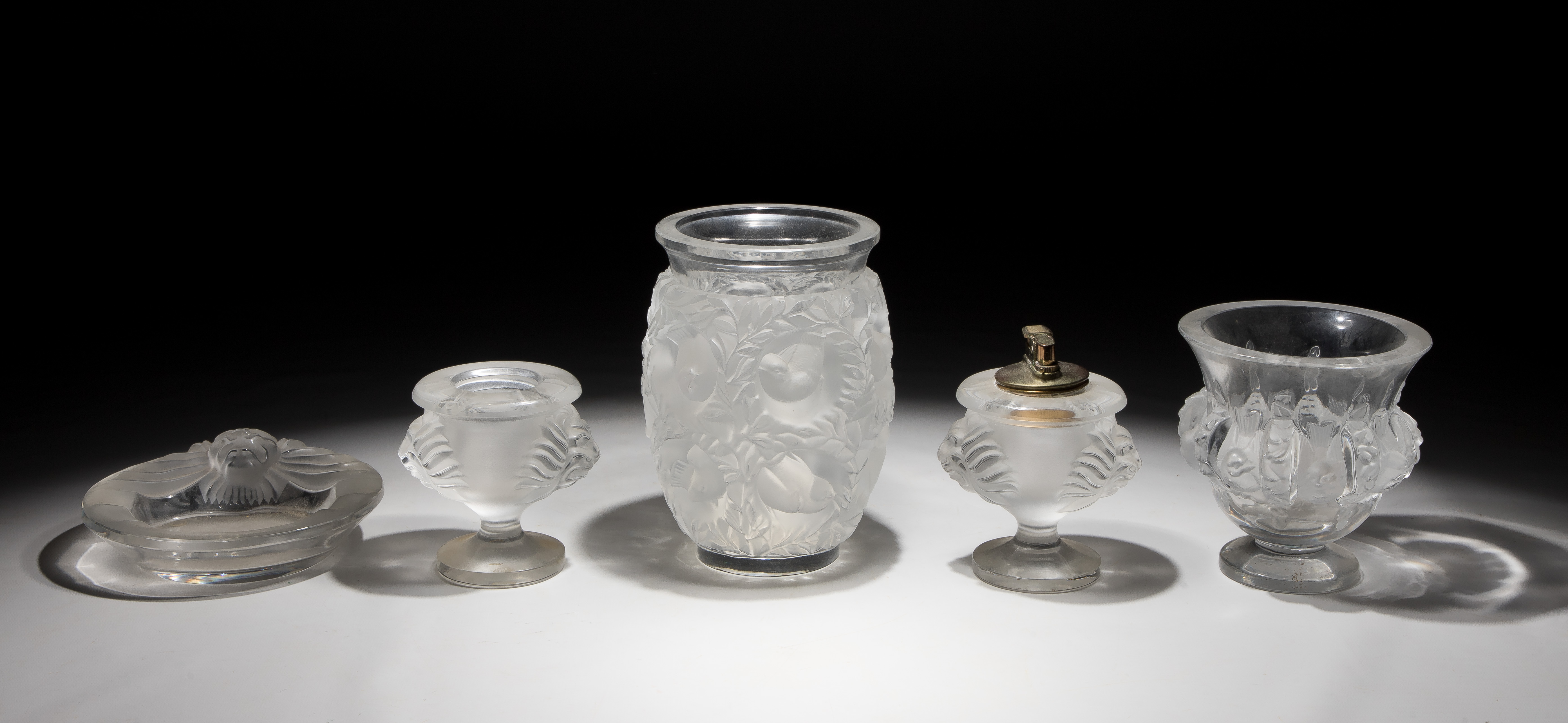 (5) items including a Dampierre vase, a Bagatelle vase and a Tete de Lion lighter, cigarette holder and ashtray, all having engraved marks underside
