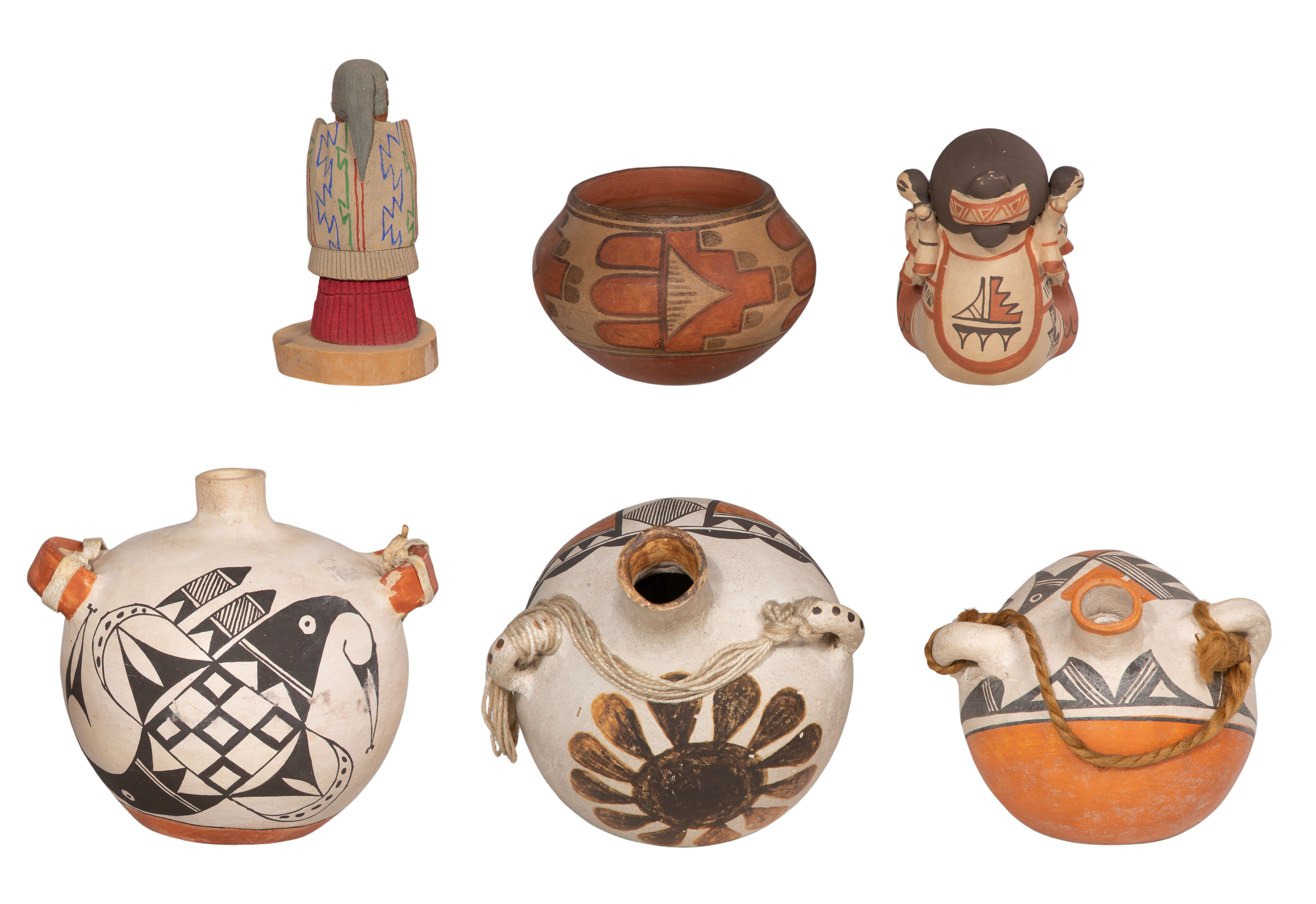 (6) total items including (3) Acoma style jugs and a Santa Ana style jar, all unsigned as well as a Cochita style storyteller figurine illegibly signed on the underside; together with a carved wood Native American figure signed and titled on the underside