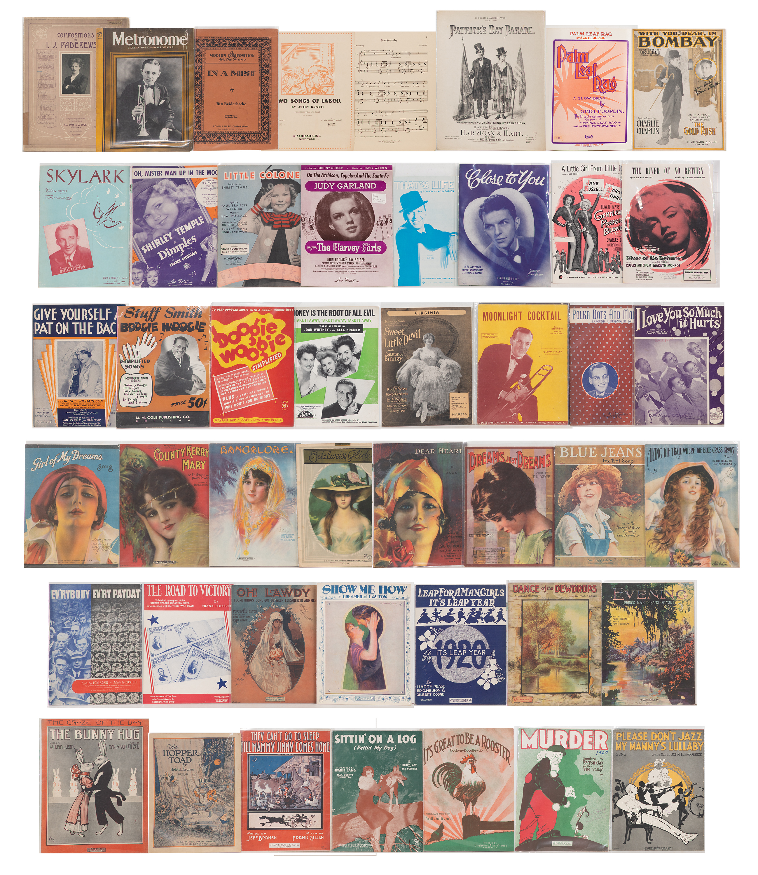 Approximately (2000) items of sheet music, spanning the turn of the 20th century to Stephen Sondheim and novelty, some covers having vibrant lithographic art illustrations, most stored in plastic sleeves; together with Elvis 45 RPM records and music, an Italian music roll and a few pieces of photographic ephemera