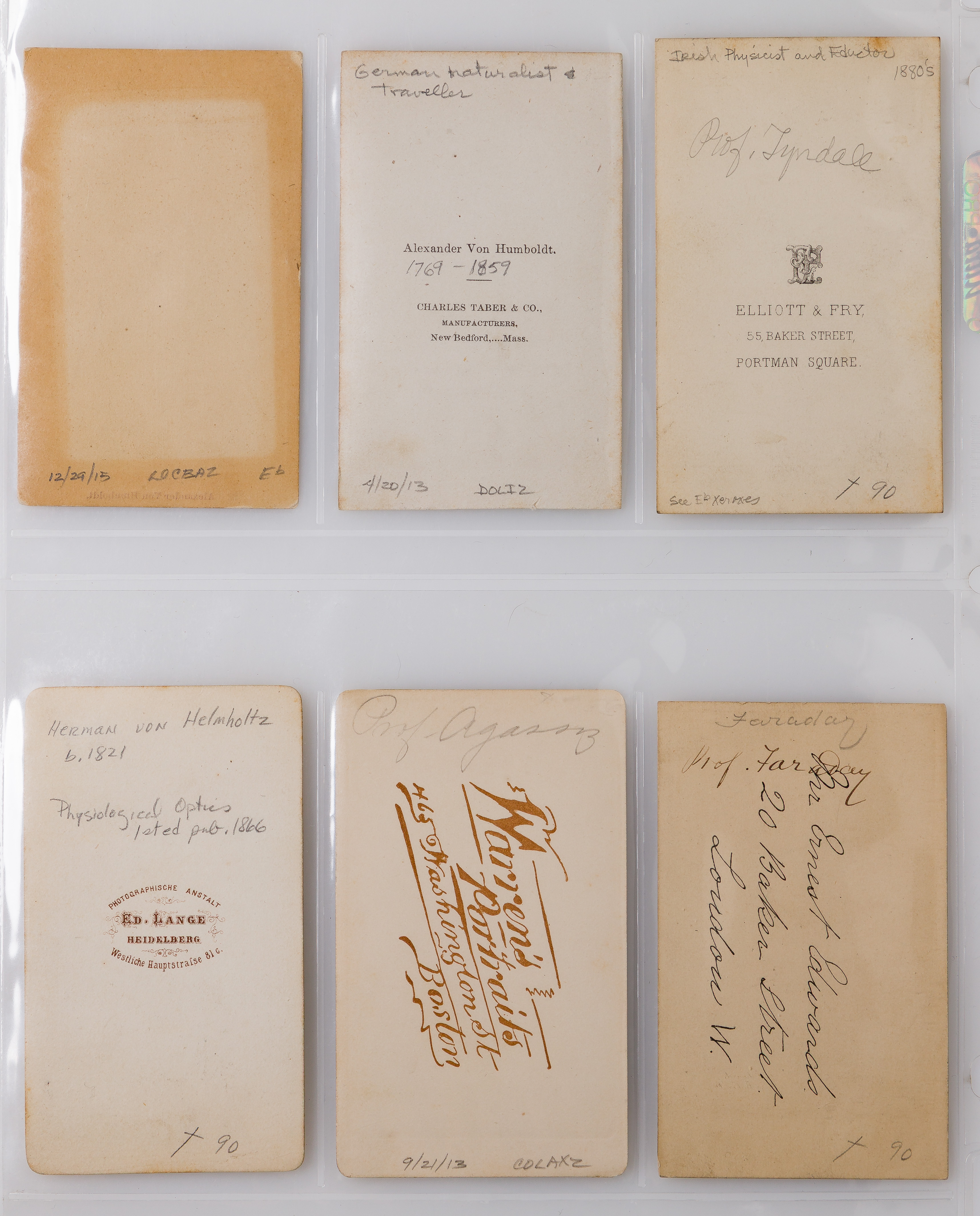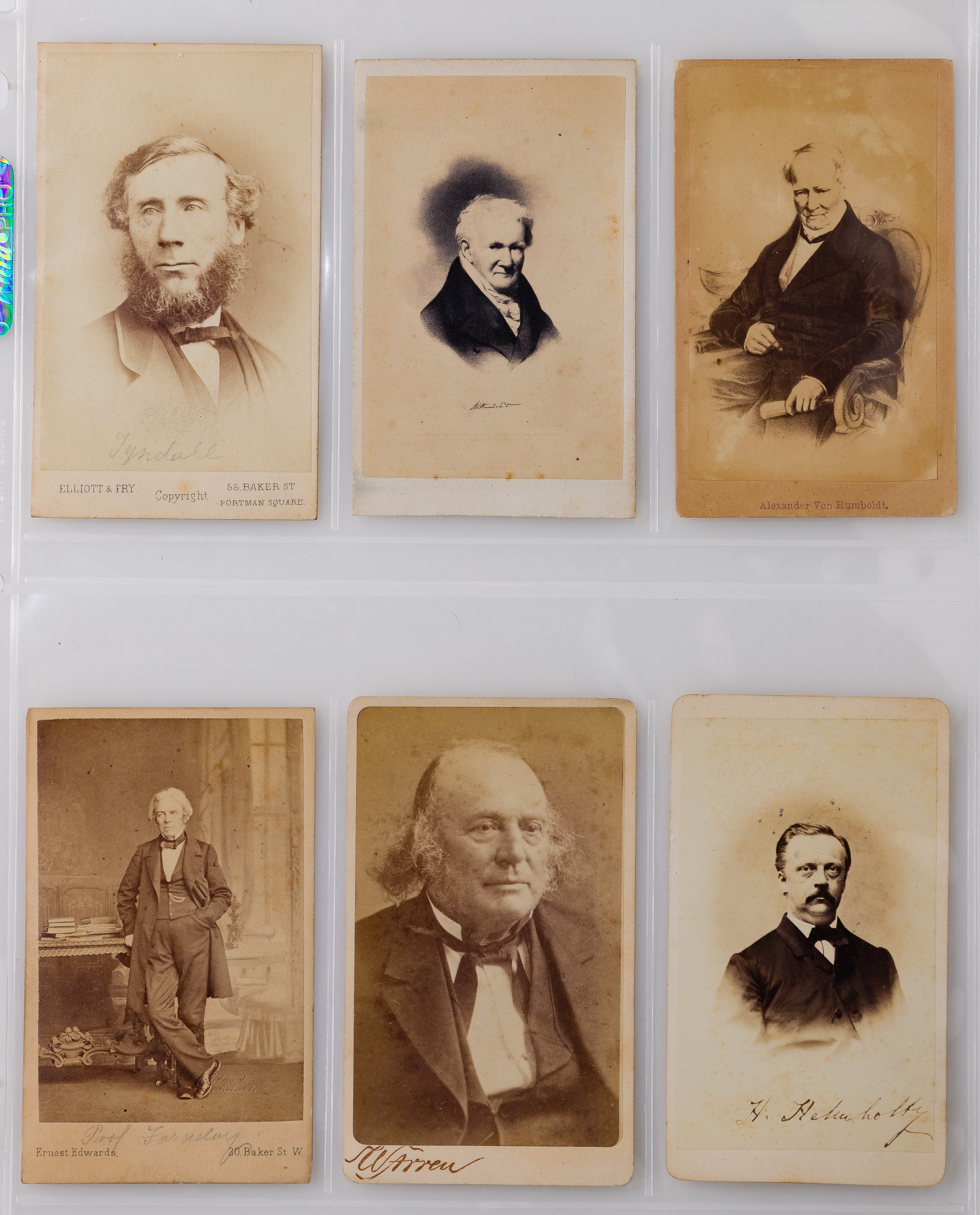 Approximately (210) total items in three binders, including cabinet cards, cartes de visite, tintypes, photographic postcards and gelatin silver prints, one binder having depictions of noted 19th and early 20th century statesmen, scientists and cultural figures including Alexander Von Humboldt, Charles Darwin, Einstein, Gustave Eiffel, Chester A. Arthur, Buffalo Bill and Will Rogers, another binder having images of smokers, the third binder having portraits; together with approximately (20) printed graphic portraits of pre-photography subjects including Founding Fathers