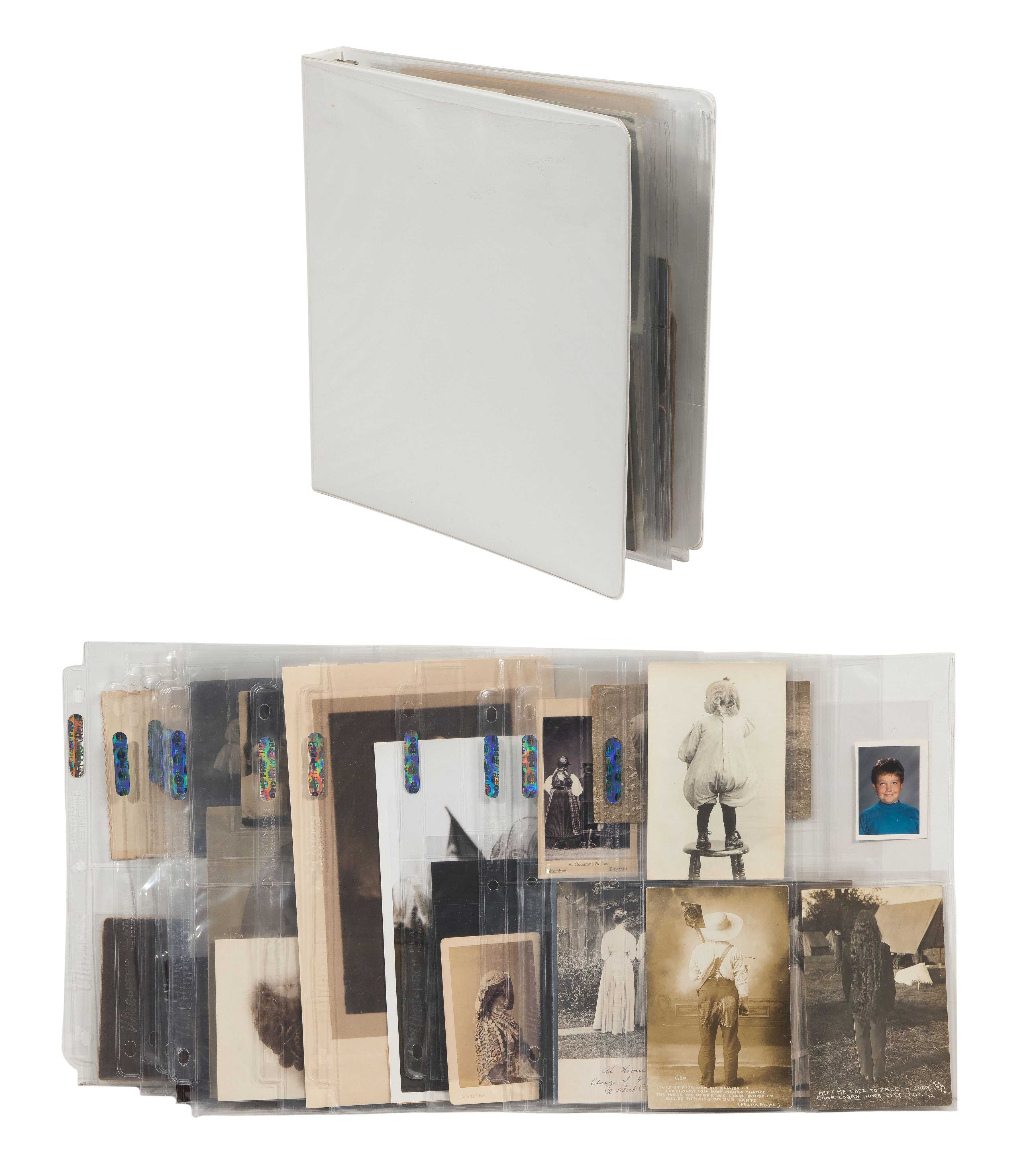 Approximately (50) items of various sizes, subjects and mediums, including posed figures in rows and from behind, in cartes de visite, postcards and photographs, most in a labeled binder