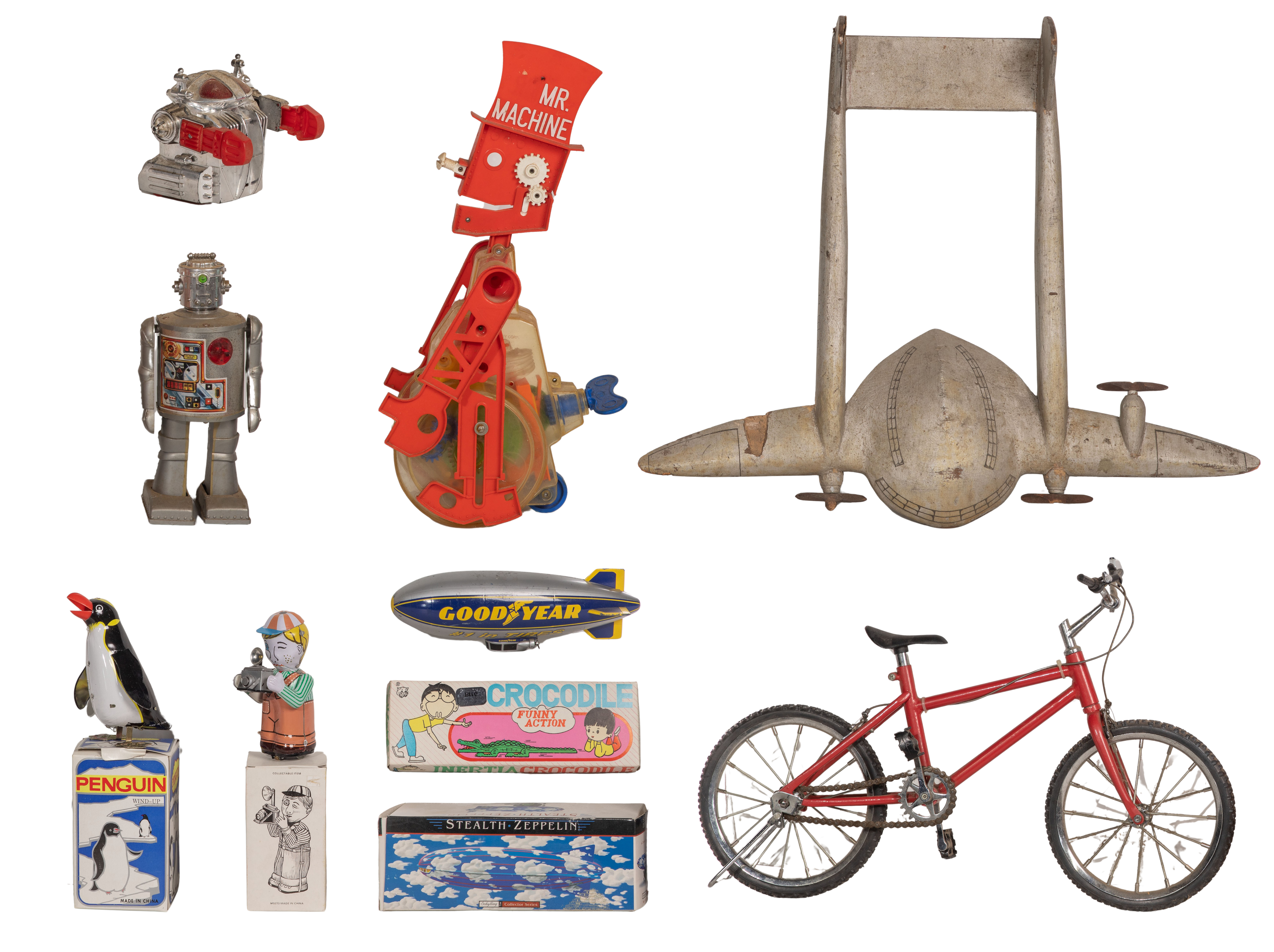 (18) items of various shapes, sizes and genres including blimps, spaceships, robots, a bicycle, some wind-up, some in original boxes