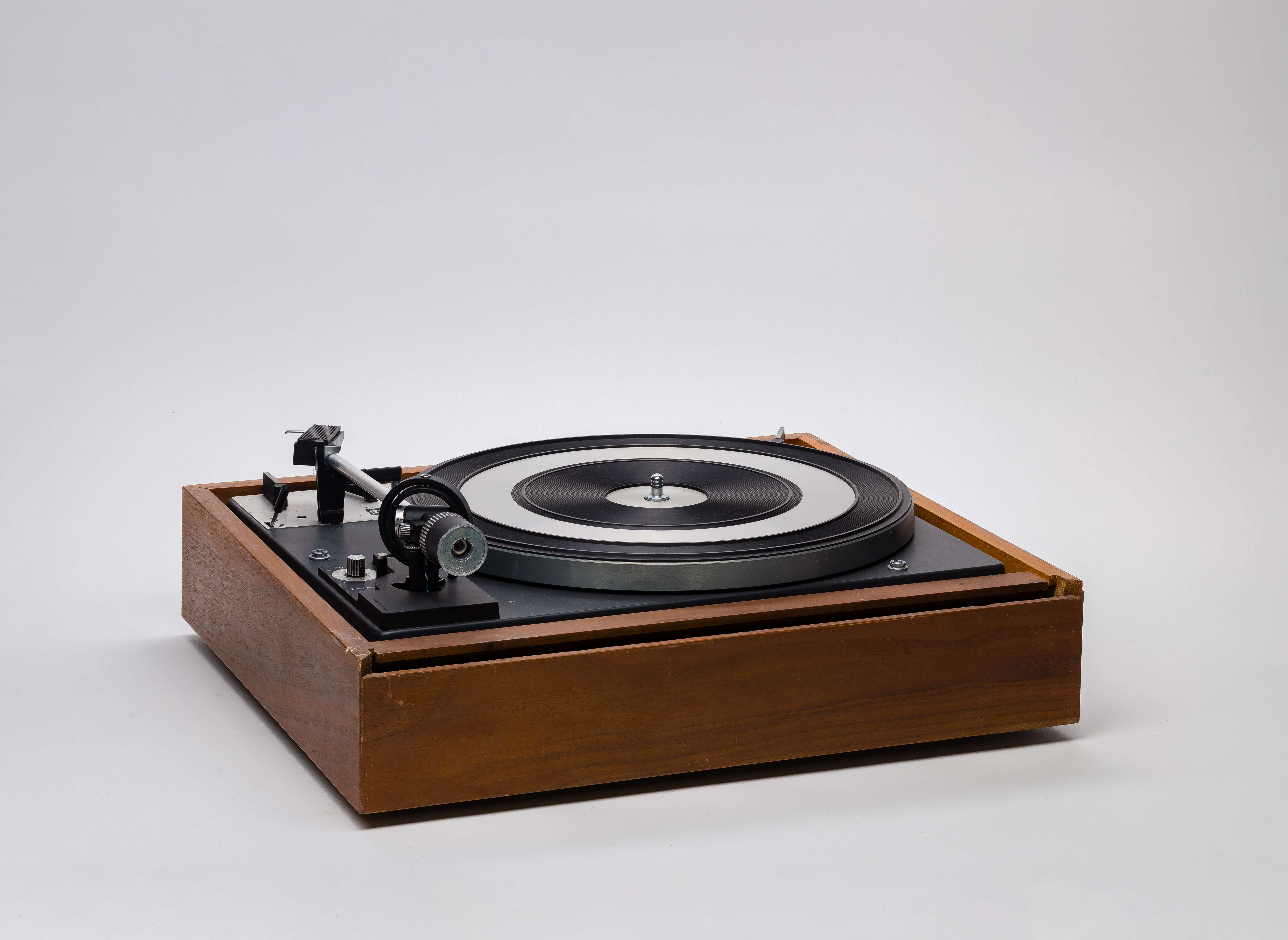 A pair of mid-century modern speakers serial #26560 and #26561 in a wood case on metal legs as well as a Limited Audio 1219 turntable