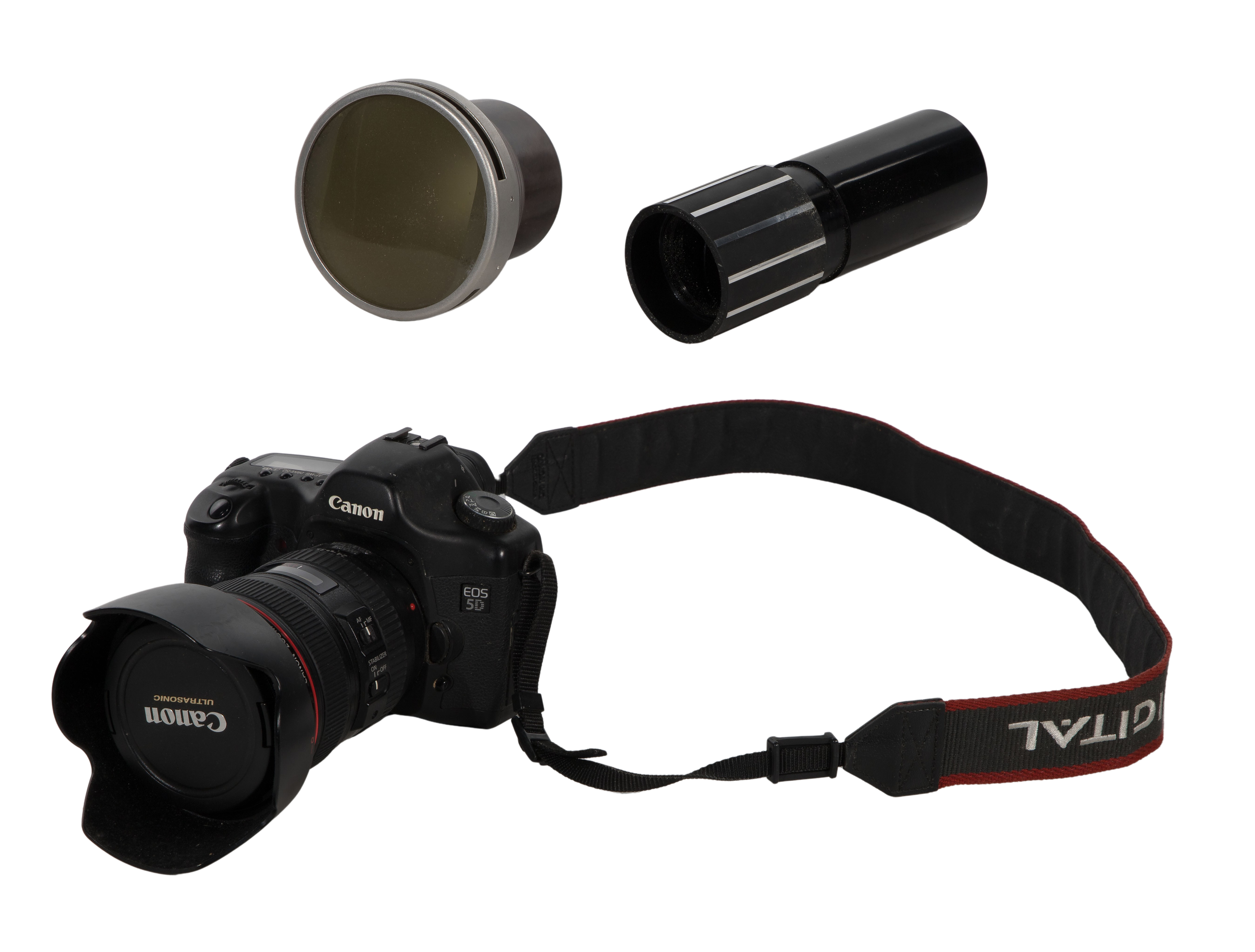(3) total items including Canon EOS 5D DS126091 professional full-frame digital single-lens reflex (DSLR) camera serial #0920703818 having a Canon EF24-105 zoom attached; together with a PB View Master in original box, a zoom projection lens in case