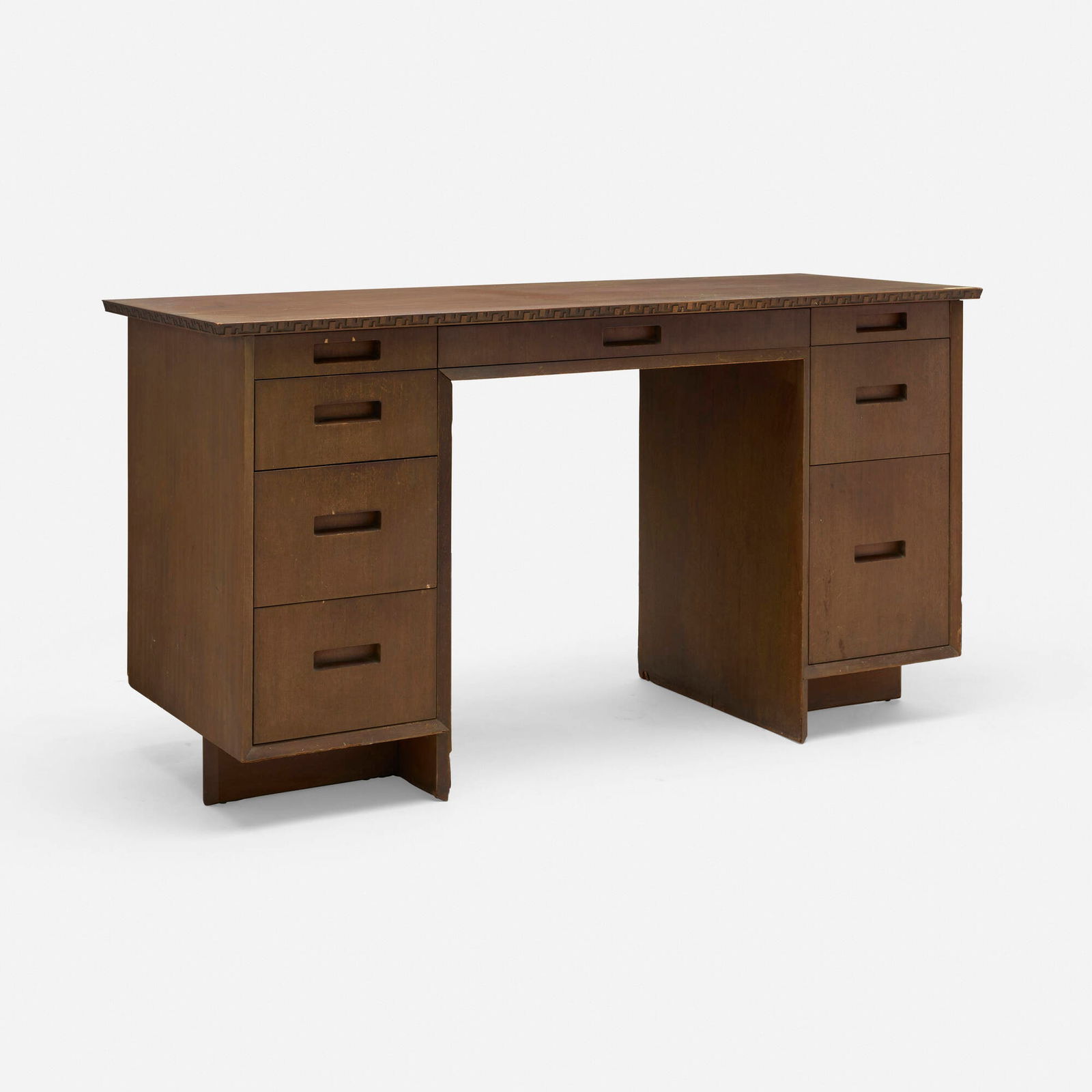 Desk features eight drawers. Stamped manufacturer's mark to center drawer 'FLW'.