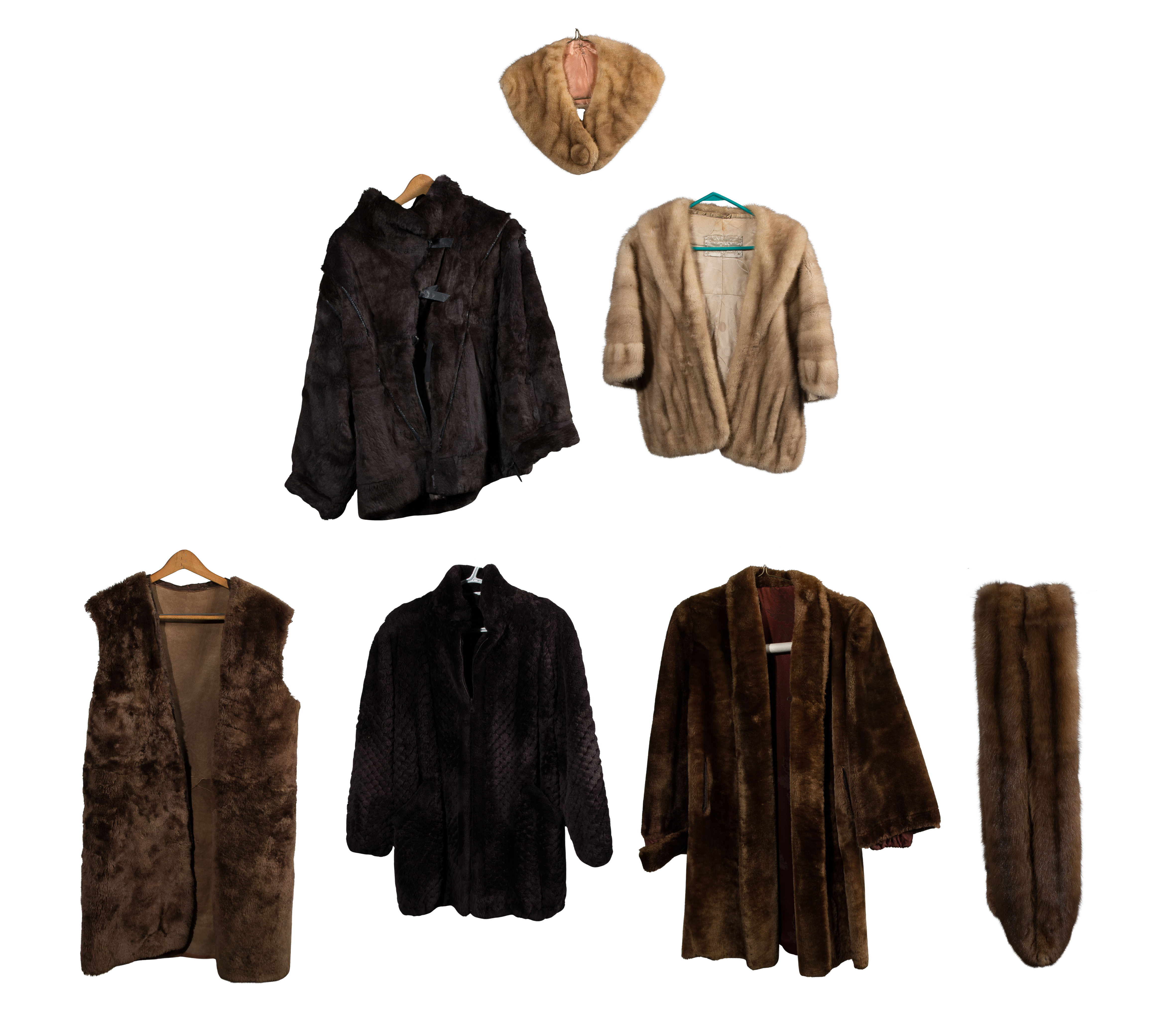(7) total items of various styles, colors and sizes including jackets, stoles, collars and a vest; together with a faux fur coat