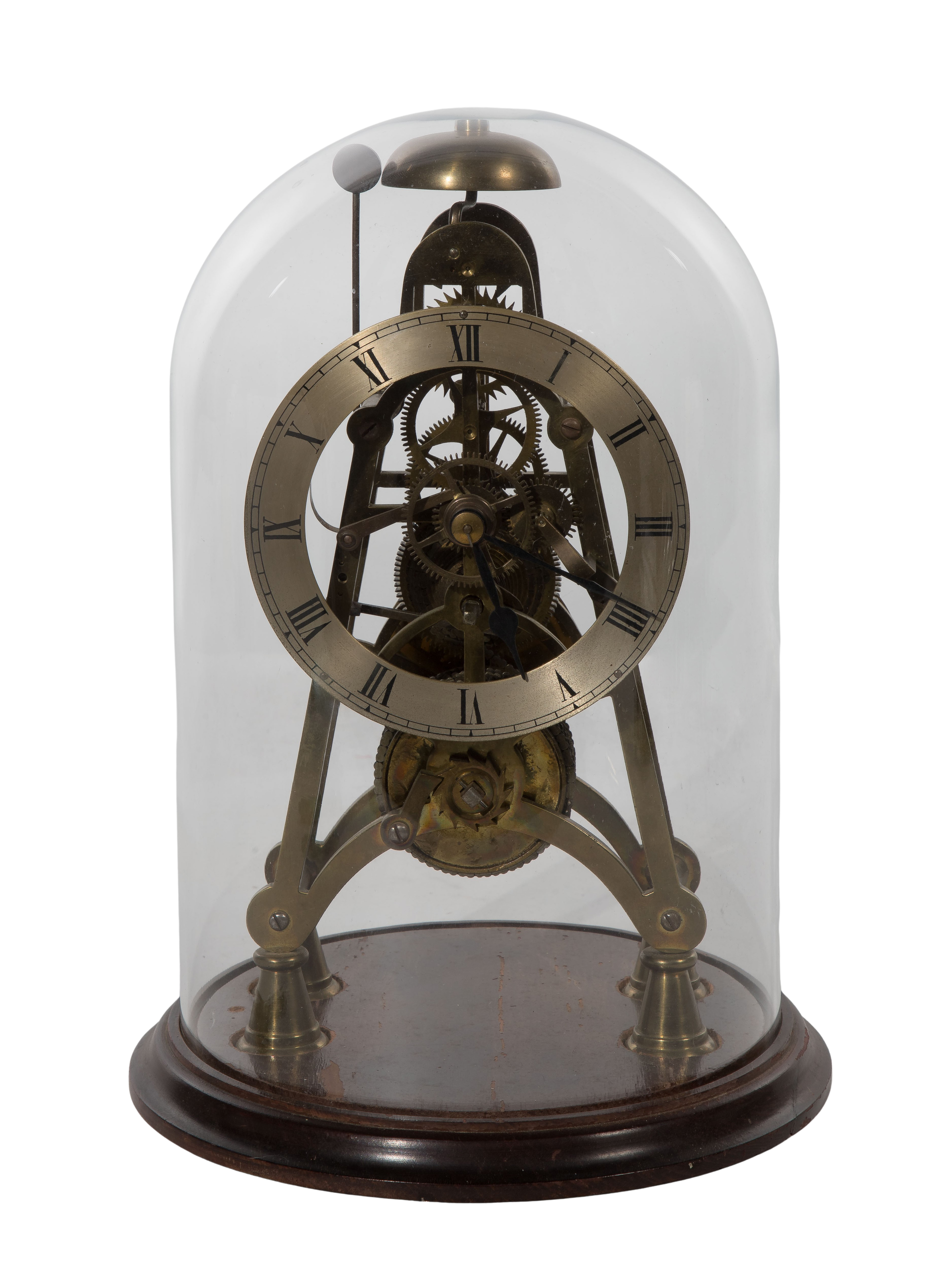 Having exposed brass fusee movement, a bell to upper, a brass dial, Roman numerals, a pendulum, on a wood base, contained within a glass cloche, including winding key