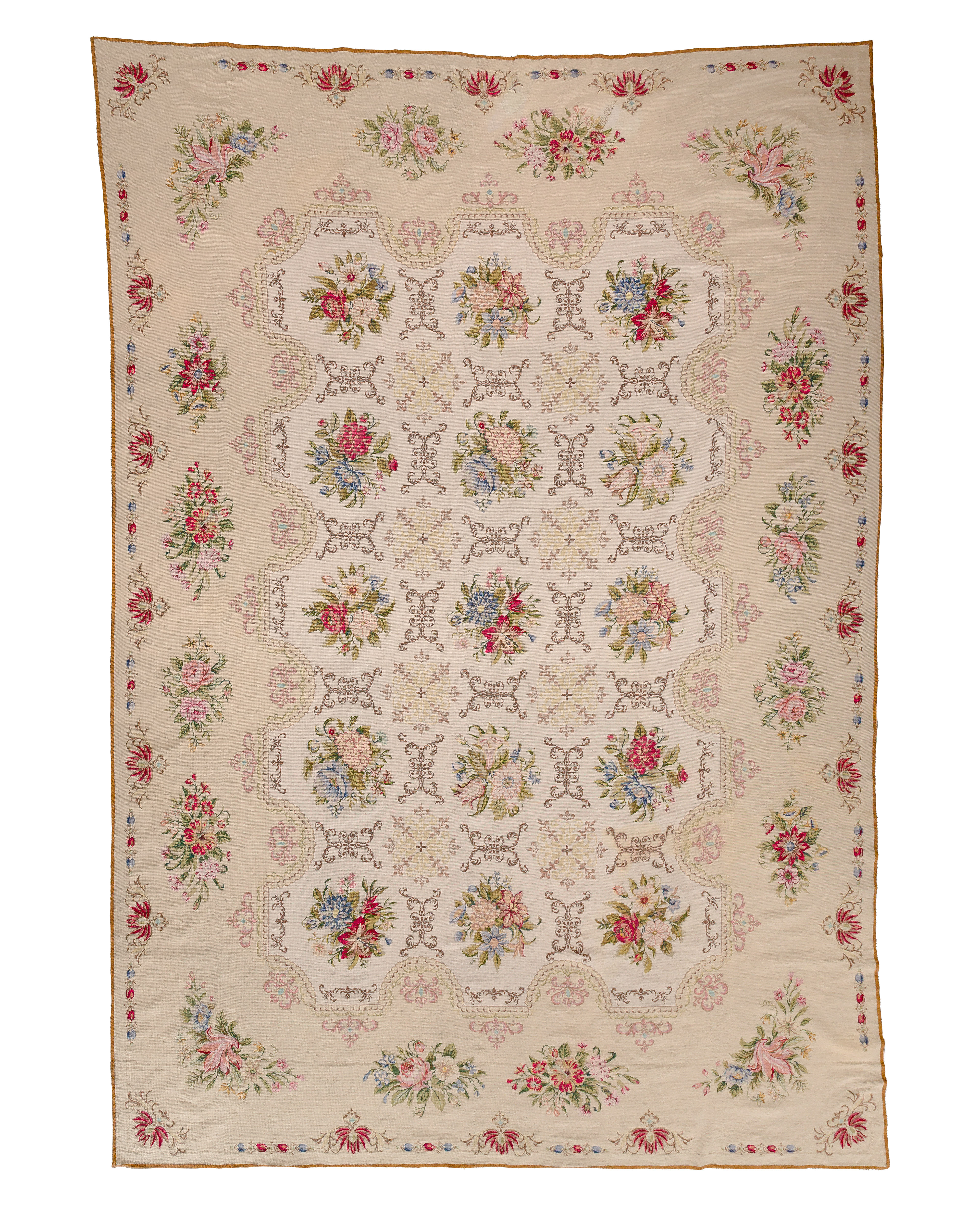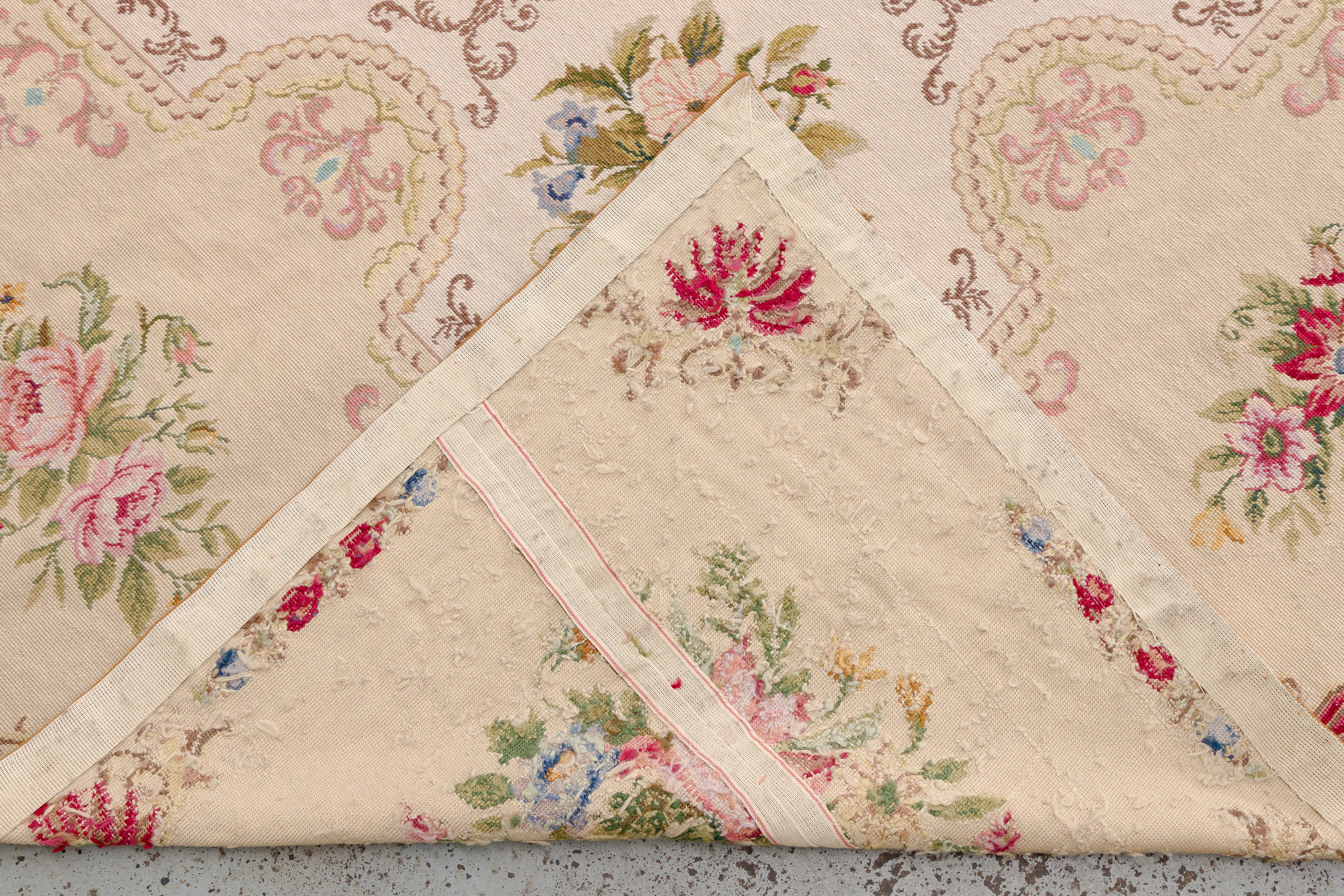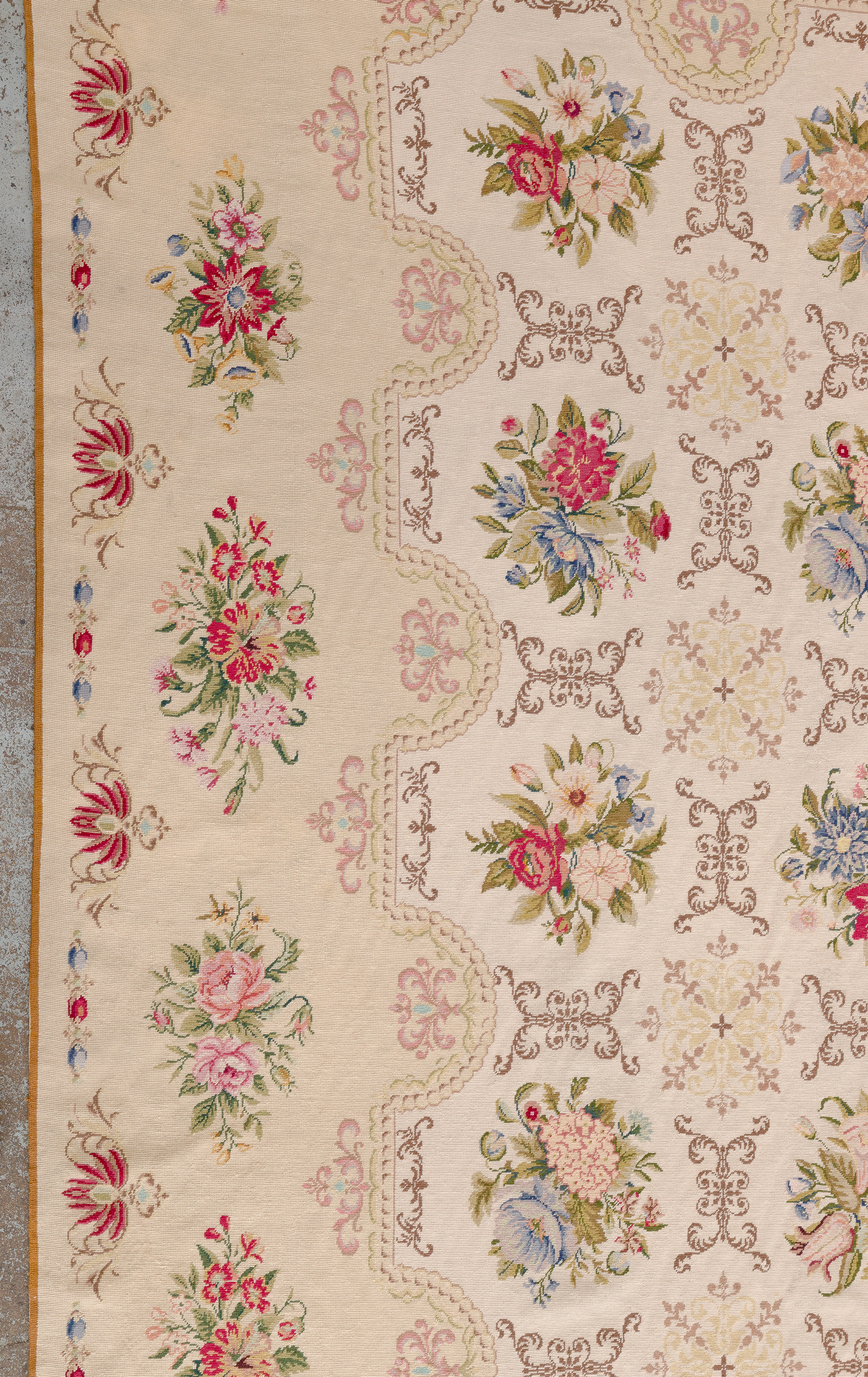 Flat weave in a floral design having hues of wine, brown, pink, blue and green on a cream field, rug constructed from three stitched together pieces