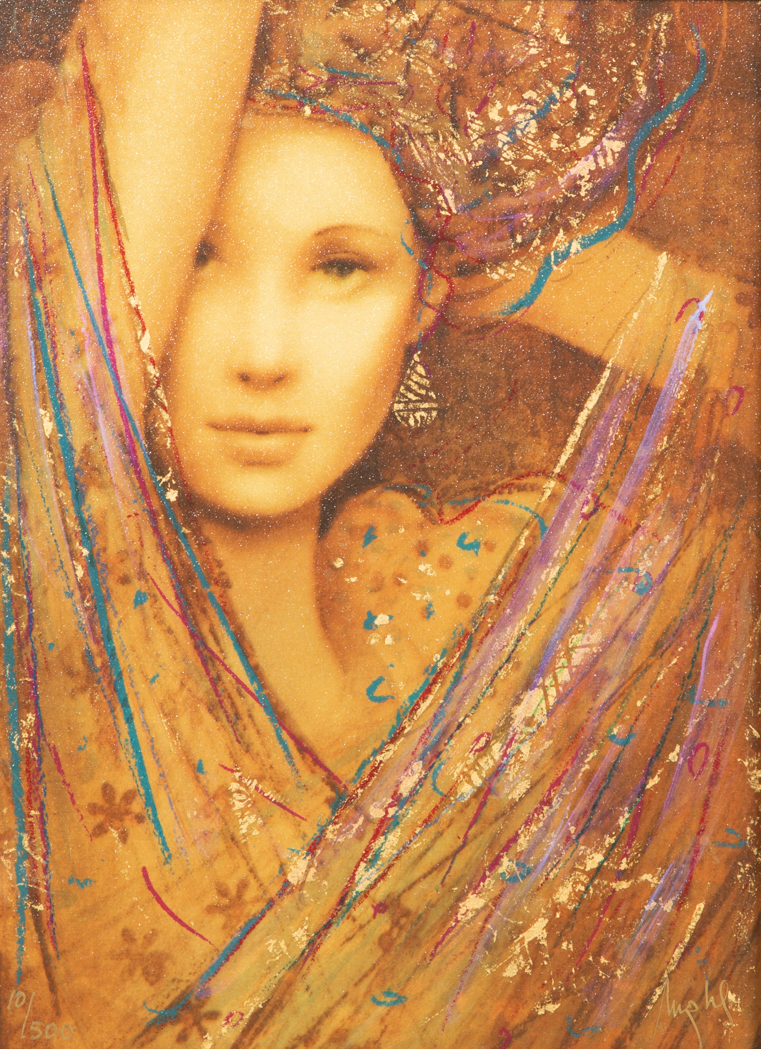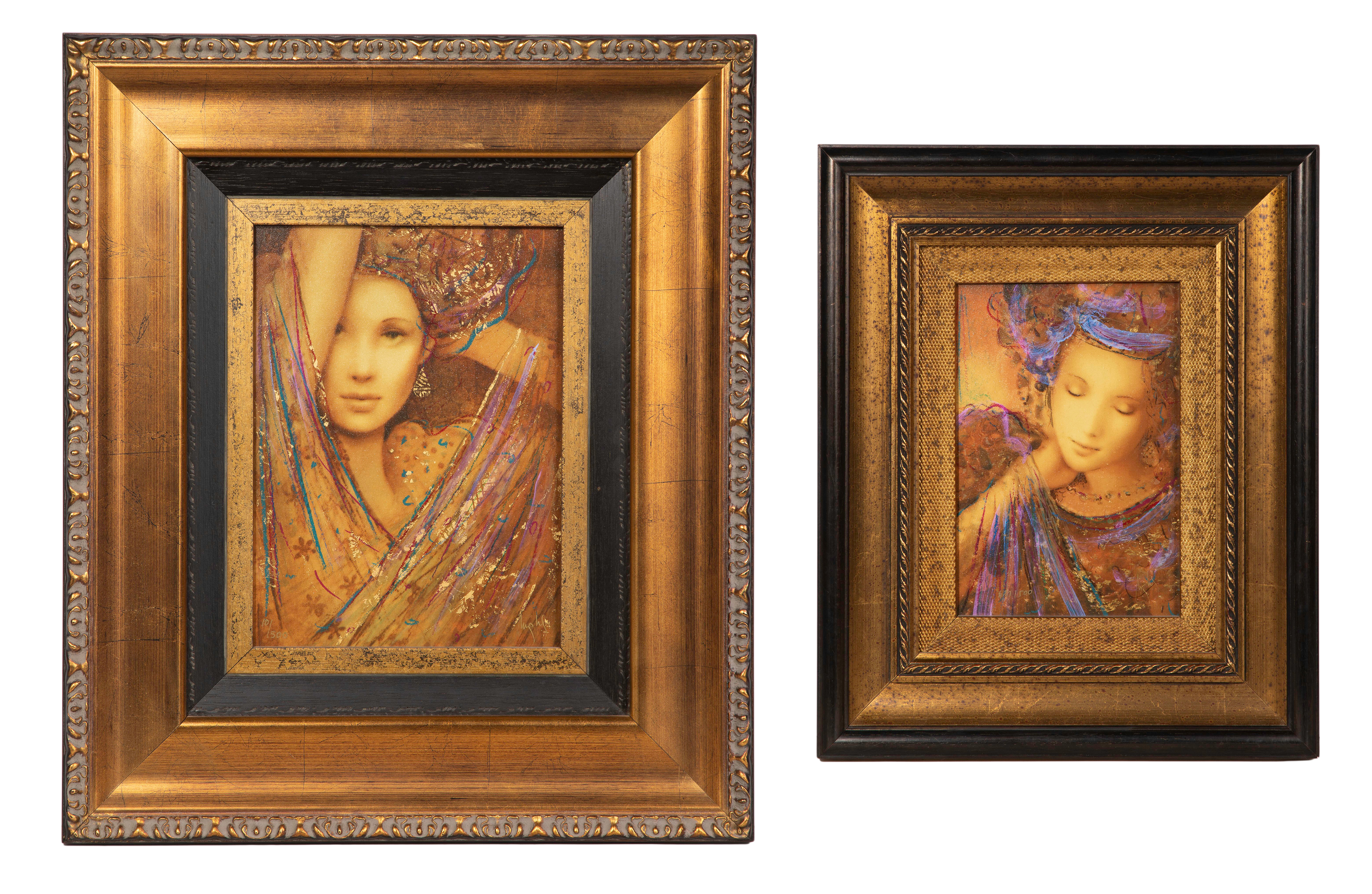 (2) items, both signed, including undated 'Phoenia Palais VIP' #939/1500, titled verso and 2006 'La Femme Charisma VIP' #101/1500 having COA, both hand embellished portraits of veiled woman, in gold-tone painted wood frames, having paperwork