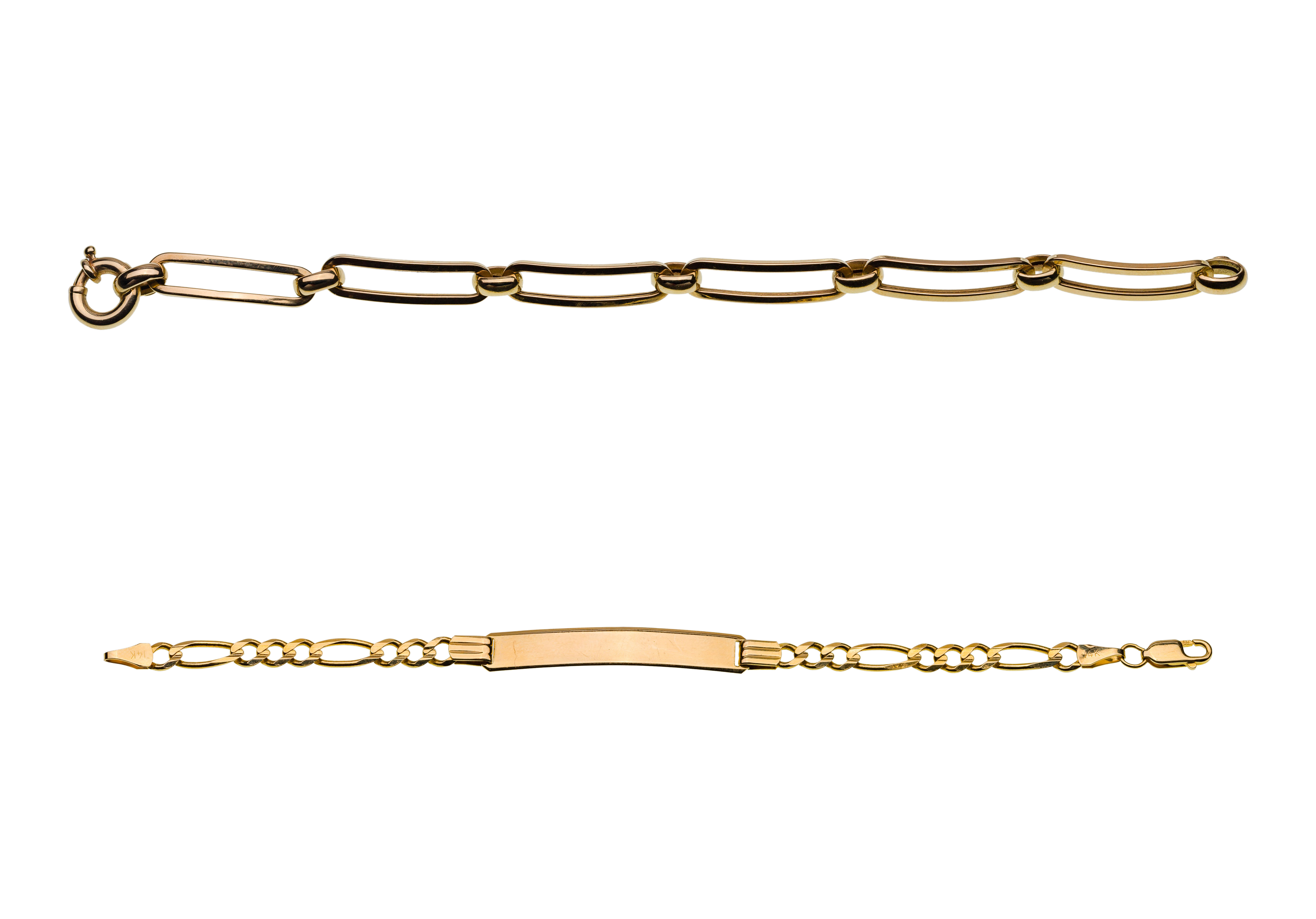 (2) items including a Figaro link identification style bracelet as well as a paper clip style link bracelet (both marked '14k')