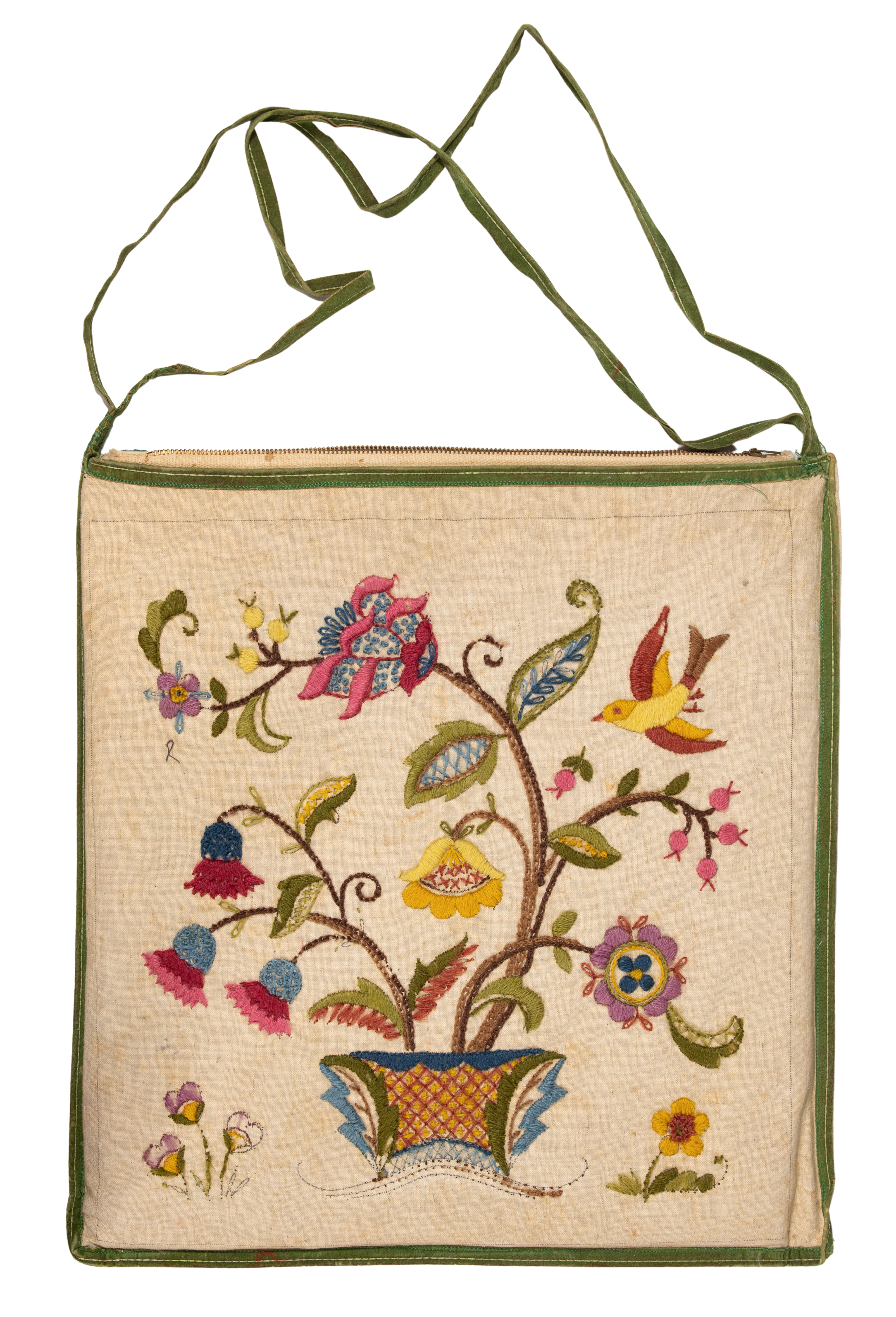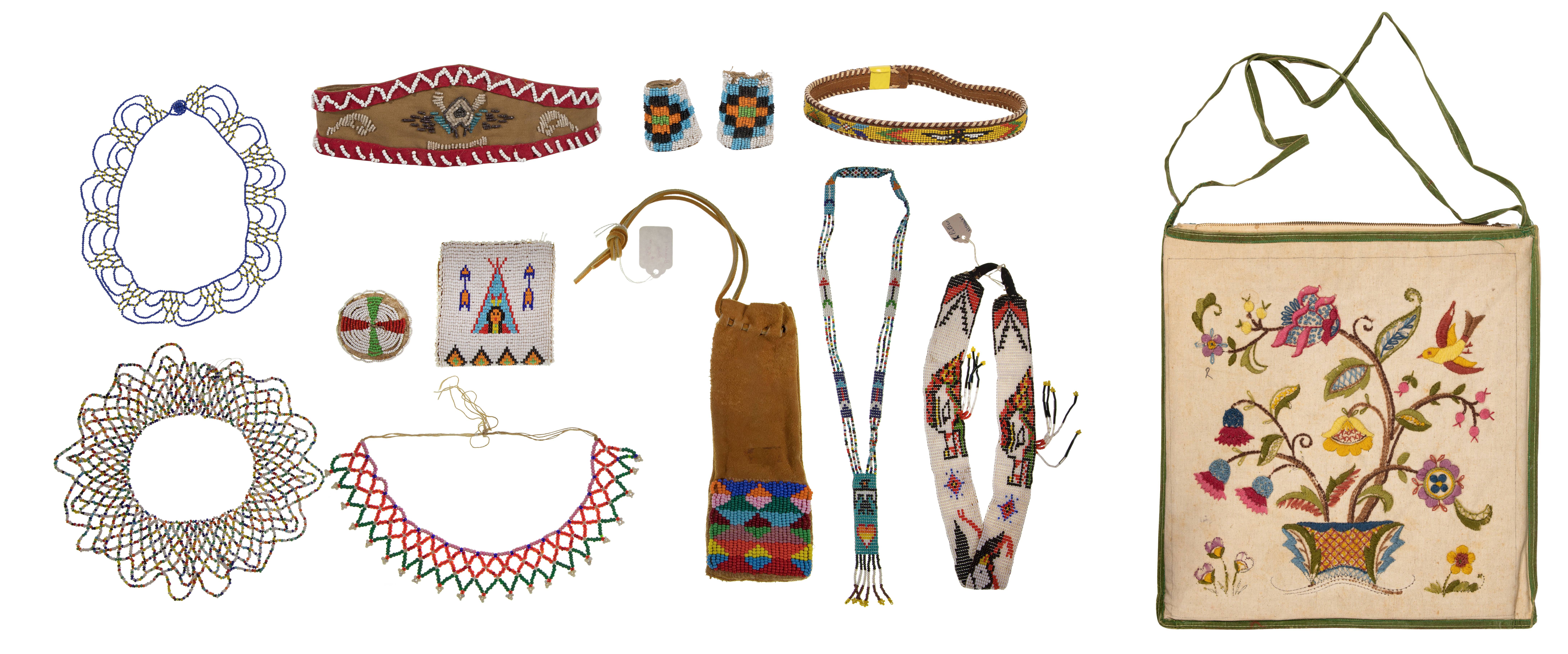(12) items including (5) necklaces, a wallet, a belt, a pin, a pair of doll cuffs, a leather bag and a sash belt as well as a loomed beadwork panel on canvas bag having multi-color diagonal zig-zag pattern within a border having arrow and whirling logs symbols, attached to a side of a machine made 15 x 15-inch canvas tote bag having a zipper closure and crewel work to the reverse side
