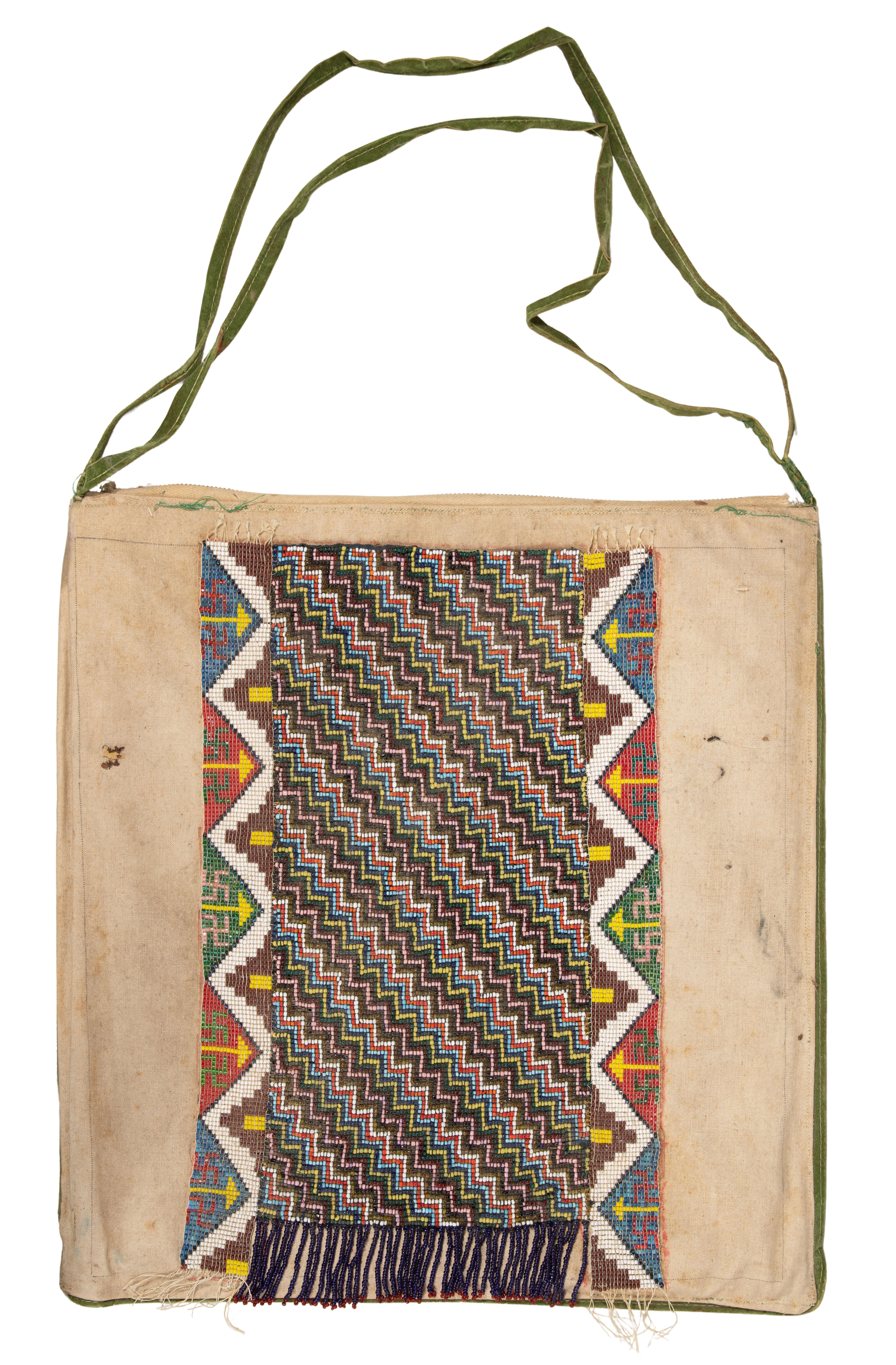 Condition: some items having missing or damaged beadwork, leather showing wear, beaded panel lifting from backing along vertical edges, probable bead loss to top and bottom edges, bag having light dirt accumulation
