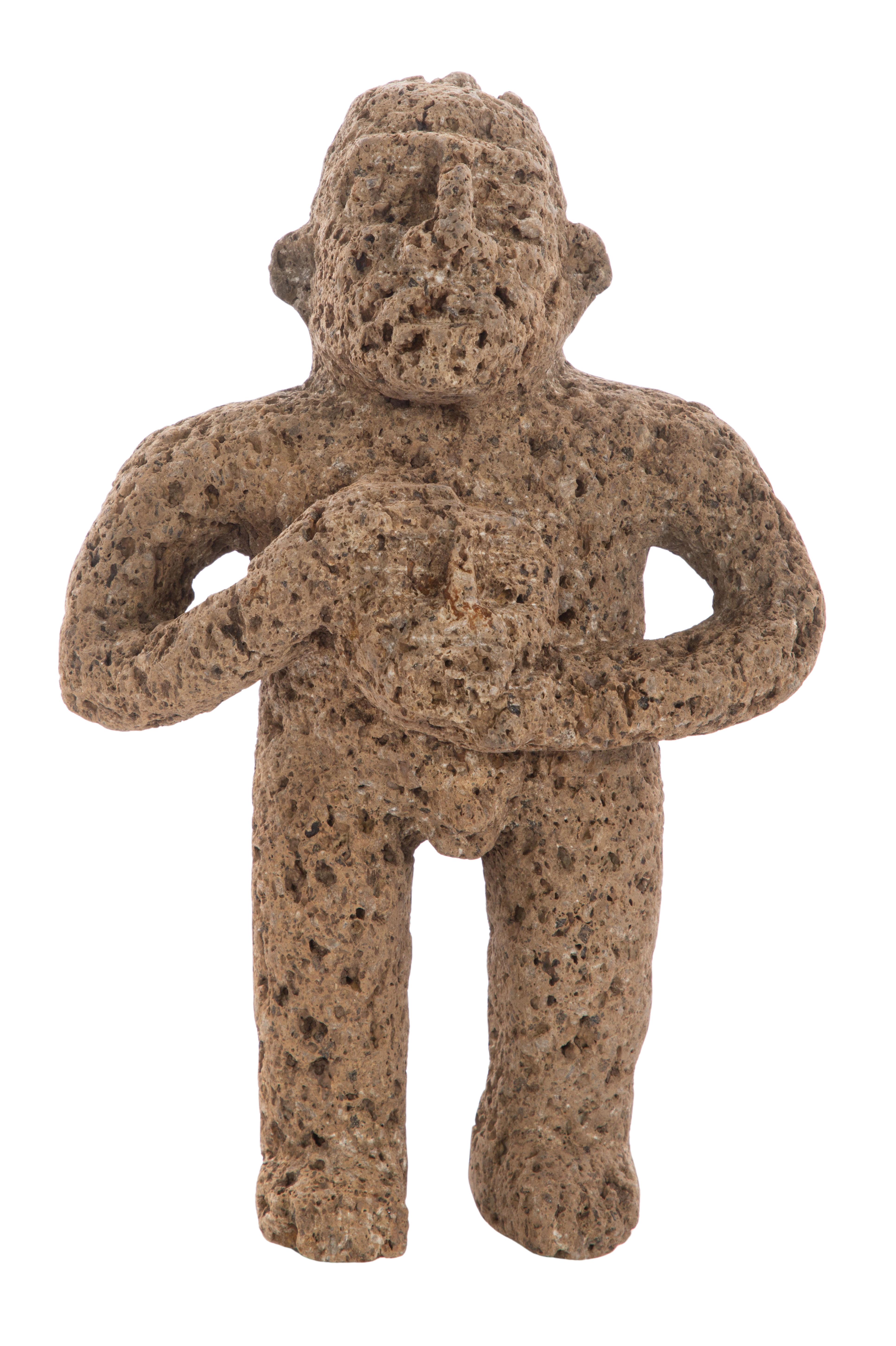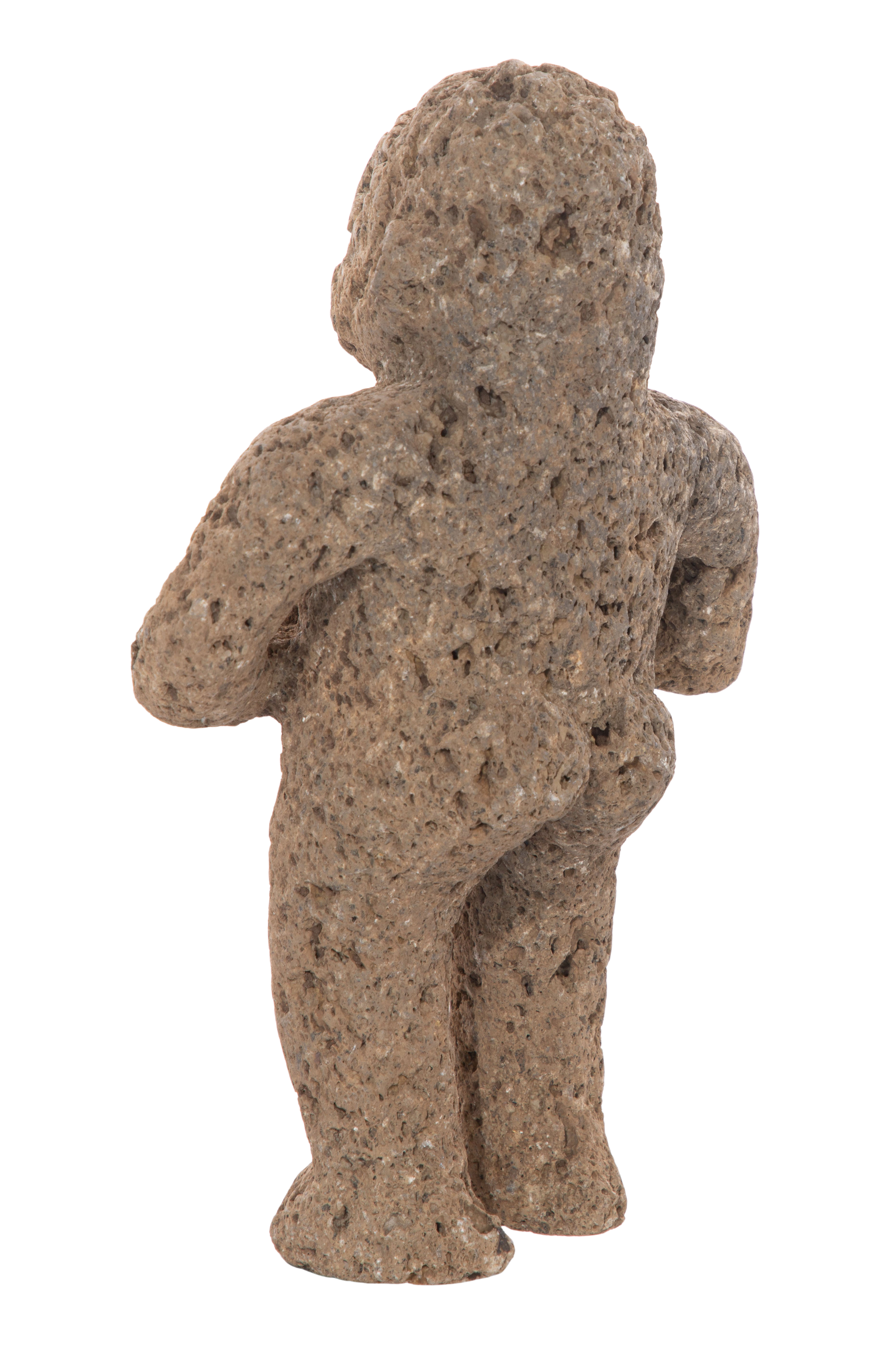 Carved from porous gray volcanic stone, depicting a standing warrior holding a human head