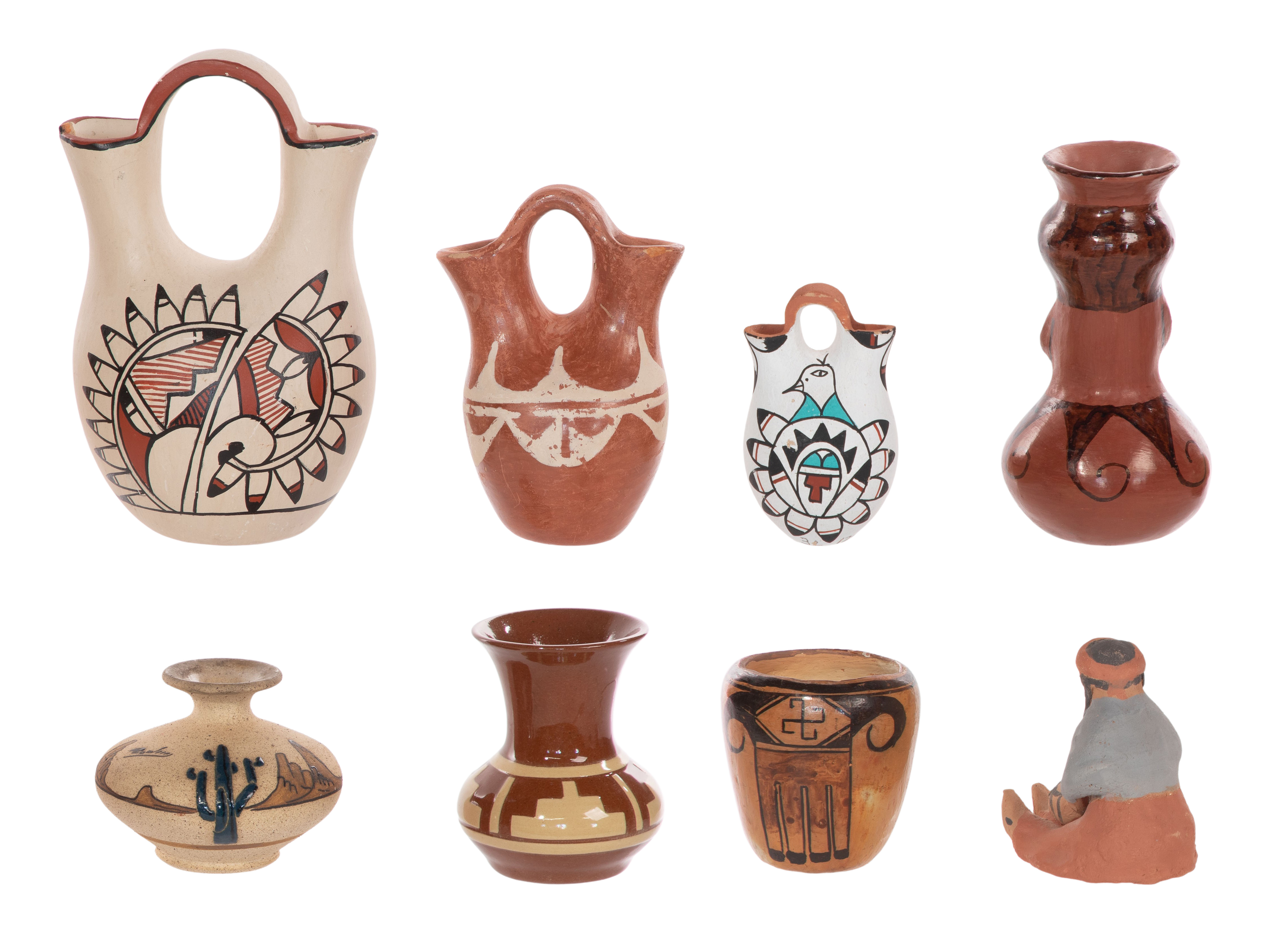 (8) items including (2) wedding vases signed from the Jemez pueblo, another wedding vase, a Hopi pot, a figurine and various vases
