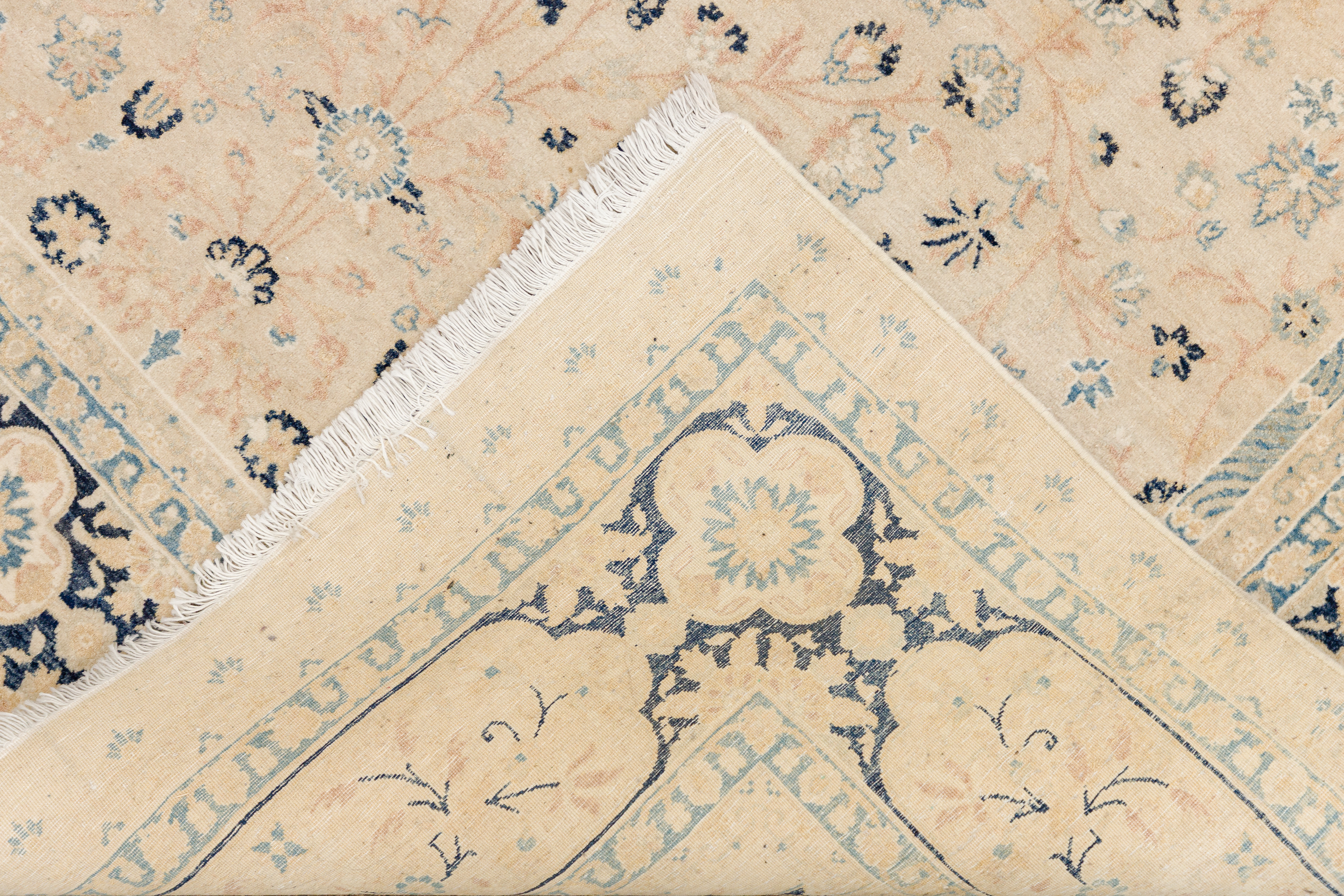 Having an abstract floral design in tan and various hues of blue on a cream field