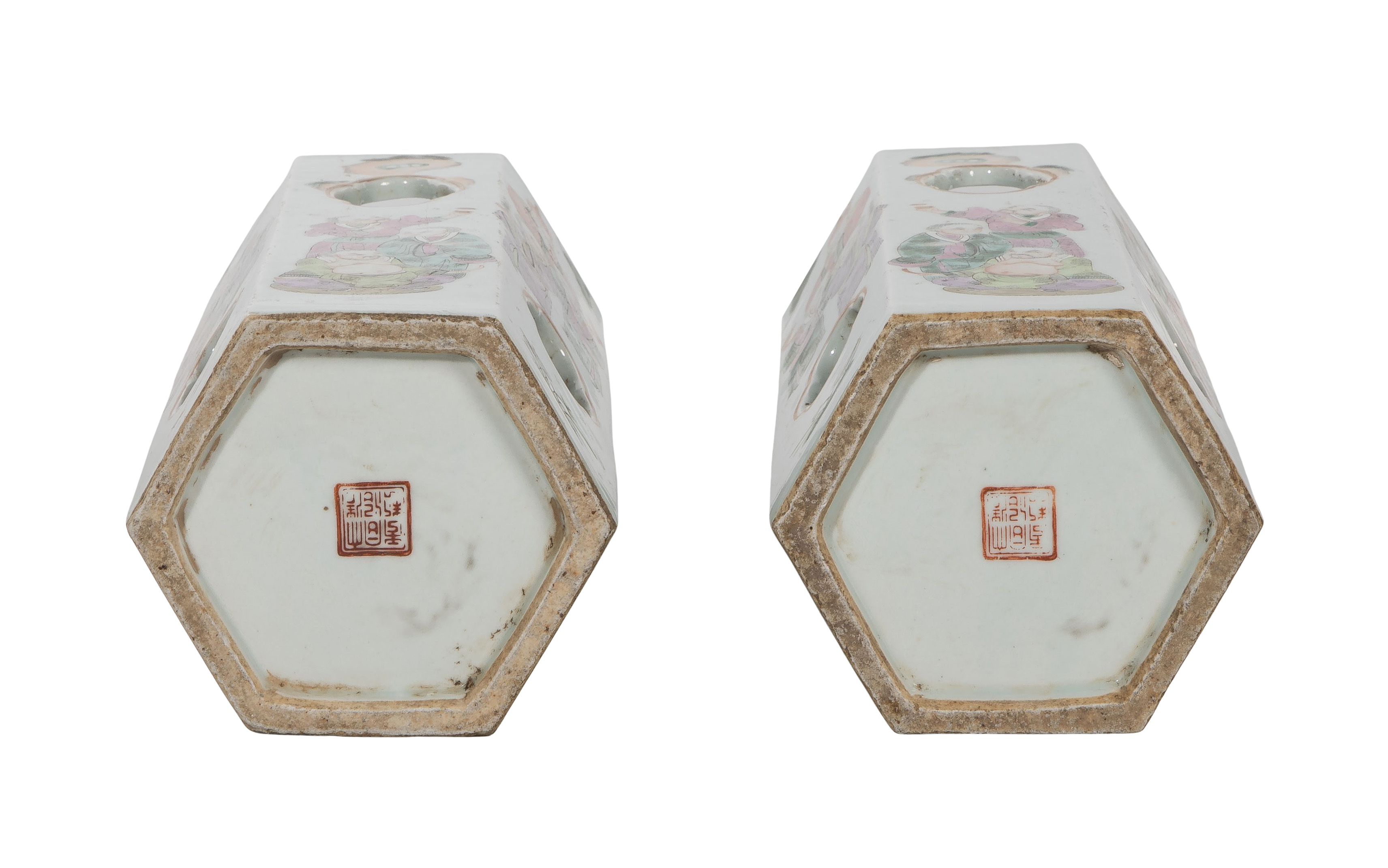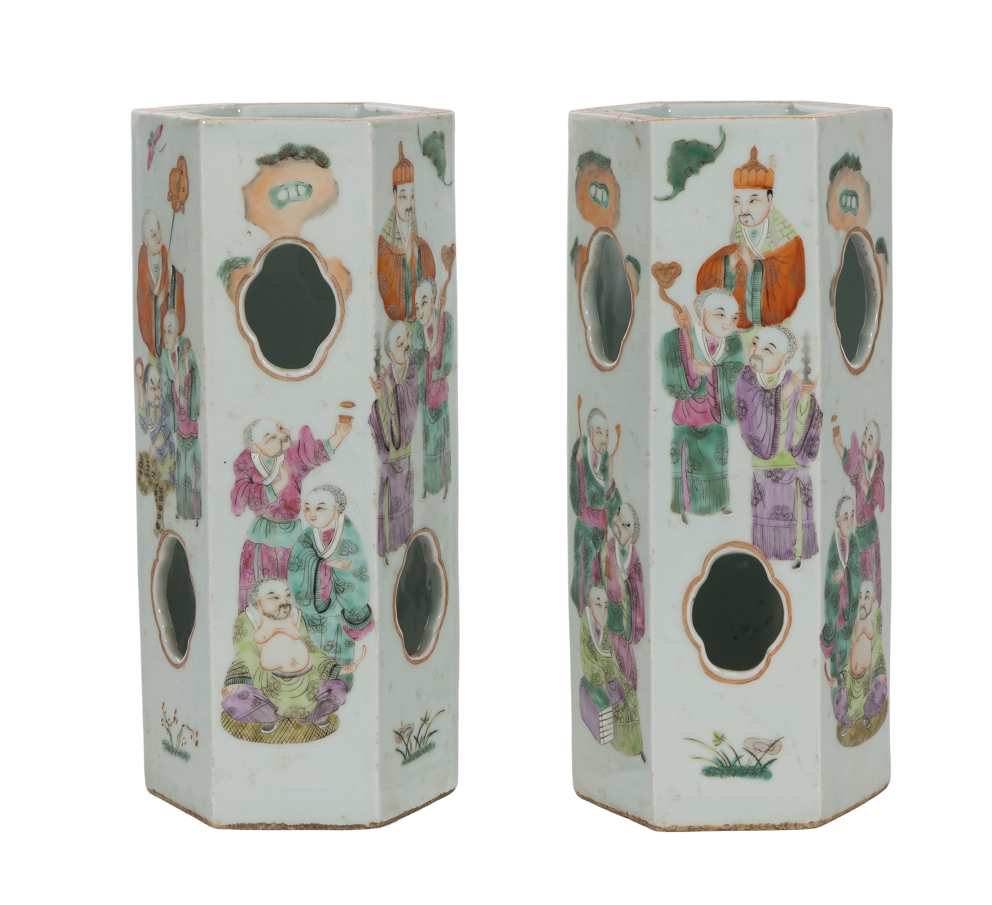 A pair of hexagonal pierced porcelain hat stands, Louhans (Buddhist Monks) in the famille rose colors and having red chop mark of Qing Dynasty Emperor, Tongzhi