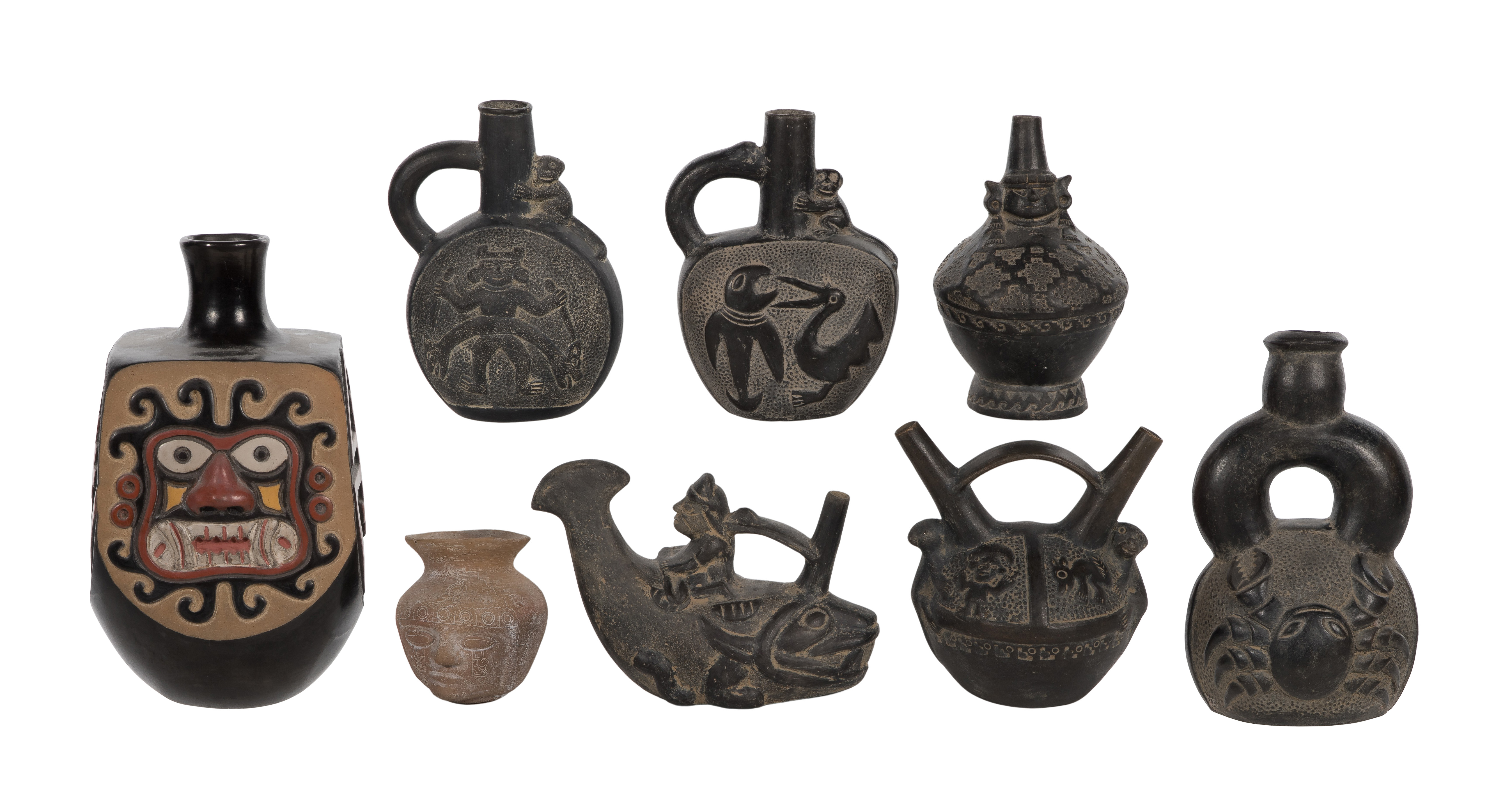 (8) items including (6) various vessels and vases in Chimu black-ware, a portrait vessel and four-sided vase of Ai Paec, some signed on underside