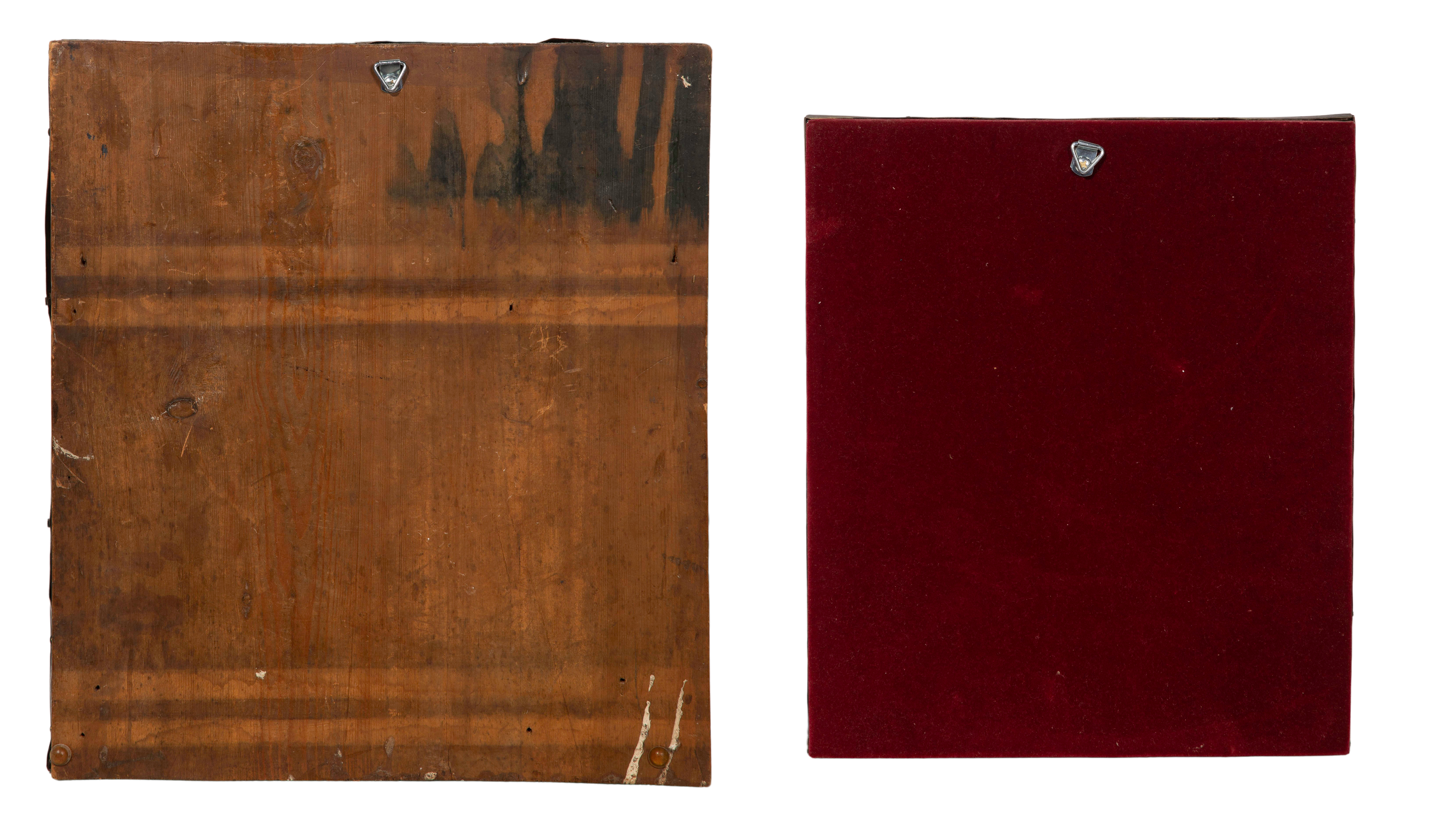 (2) items including a Holy Great Martyr Panteleimon having an embossed copper-tone oklad and a depiction of Mary with the Christ Child having a brass oklad