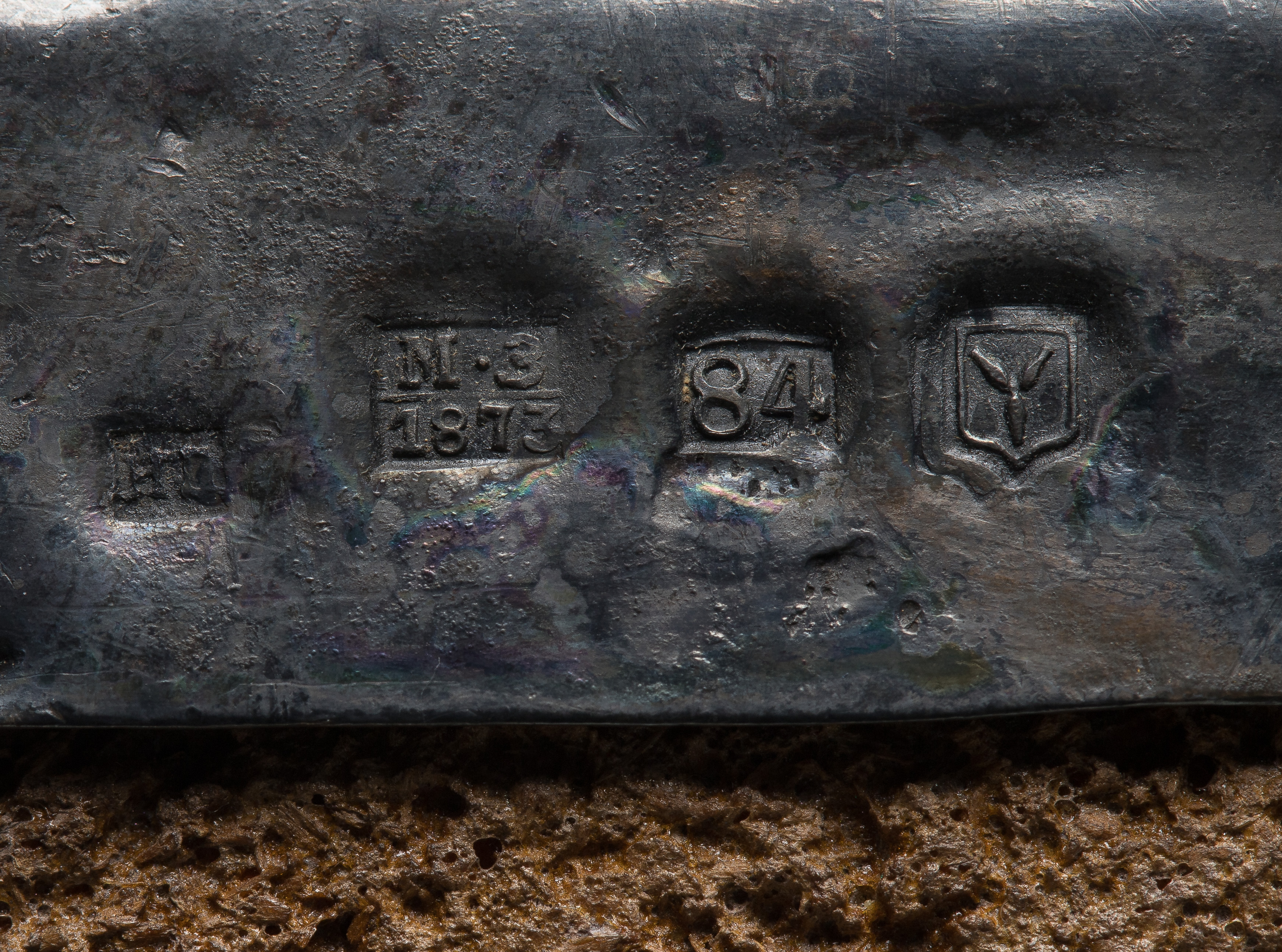 A hand painted wood panel icon of Christ Pantocrator behind a hallmarked, engraved silver oklad having attached pierced repousse halo and unidentified maker mark 'HD', dated '1875' assay mark, '84' and unidentified town mark, retaining a Barbara and Richard Kaszuba Antiques, London label verso