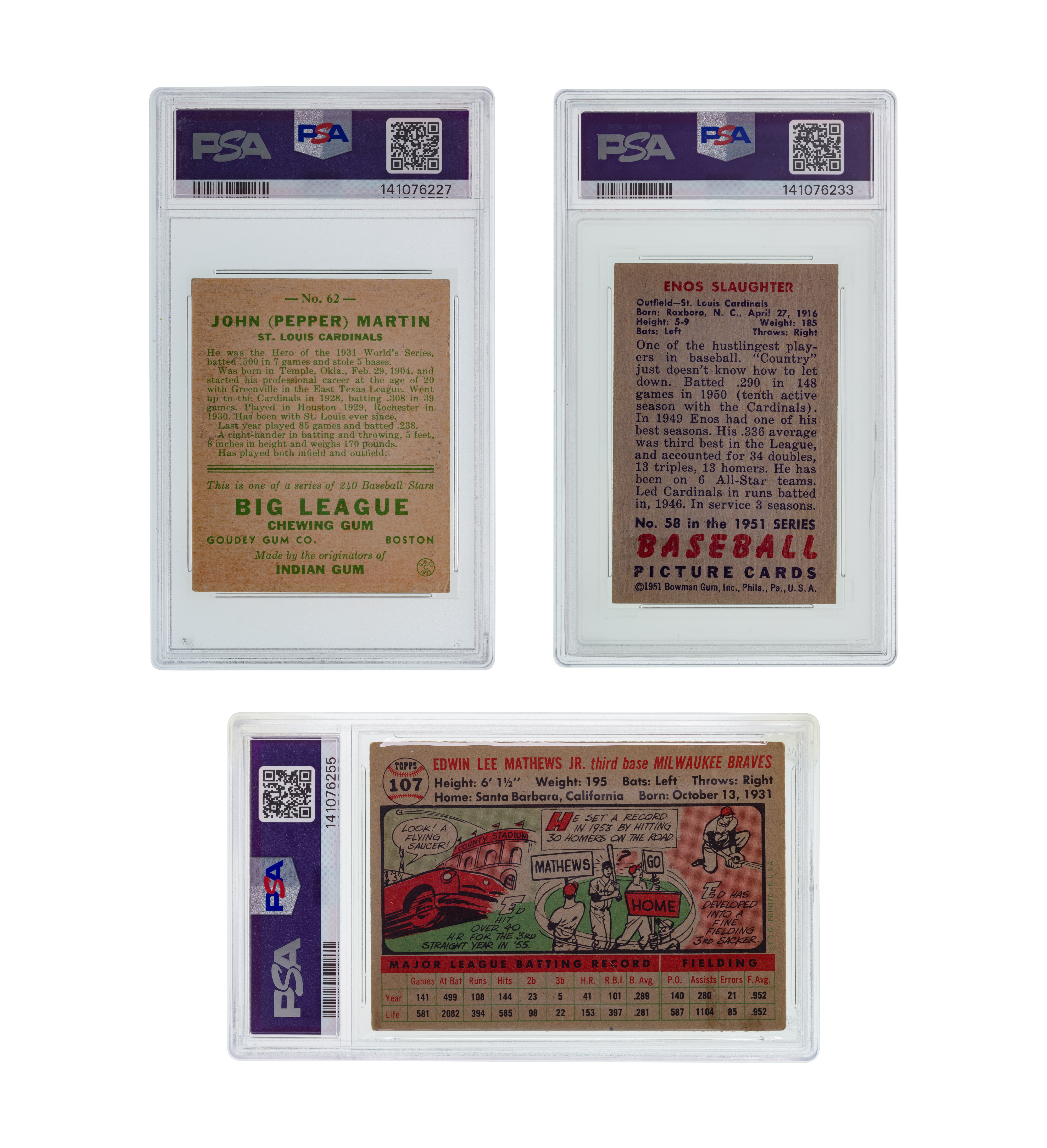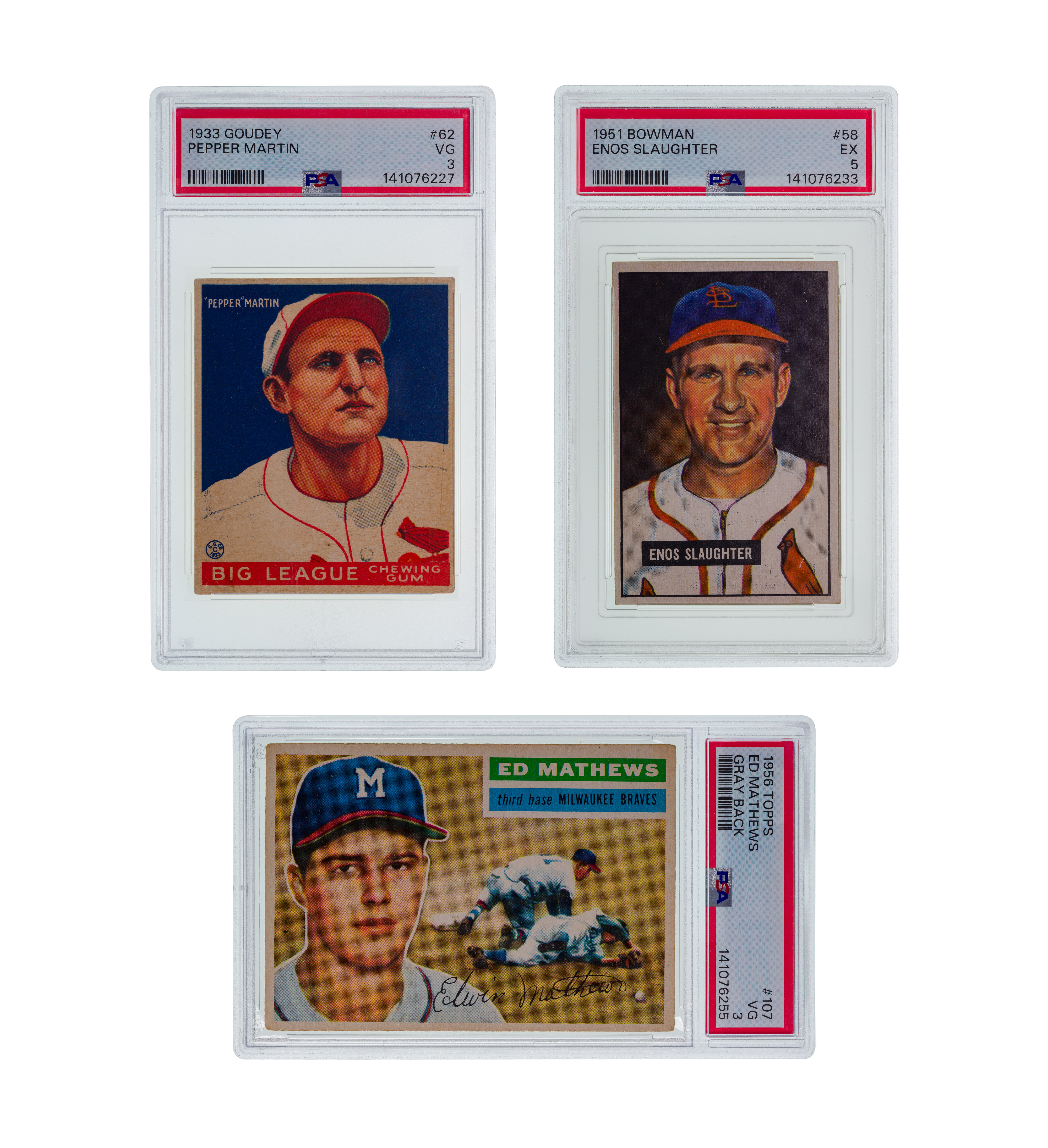 (3) items including a 1933 Goudey Pepper Martin VG-3, a 1951 Bowman Enos Slaughter EX-5 and a 1956 Topps Ed Mathews VG-3, all PSA graded