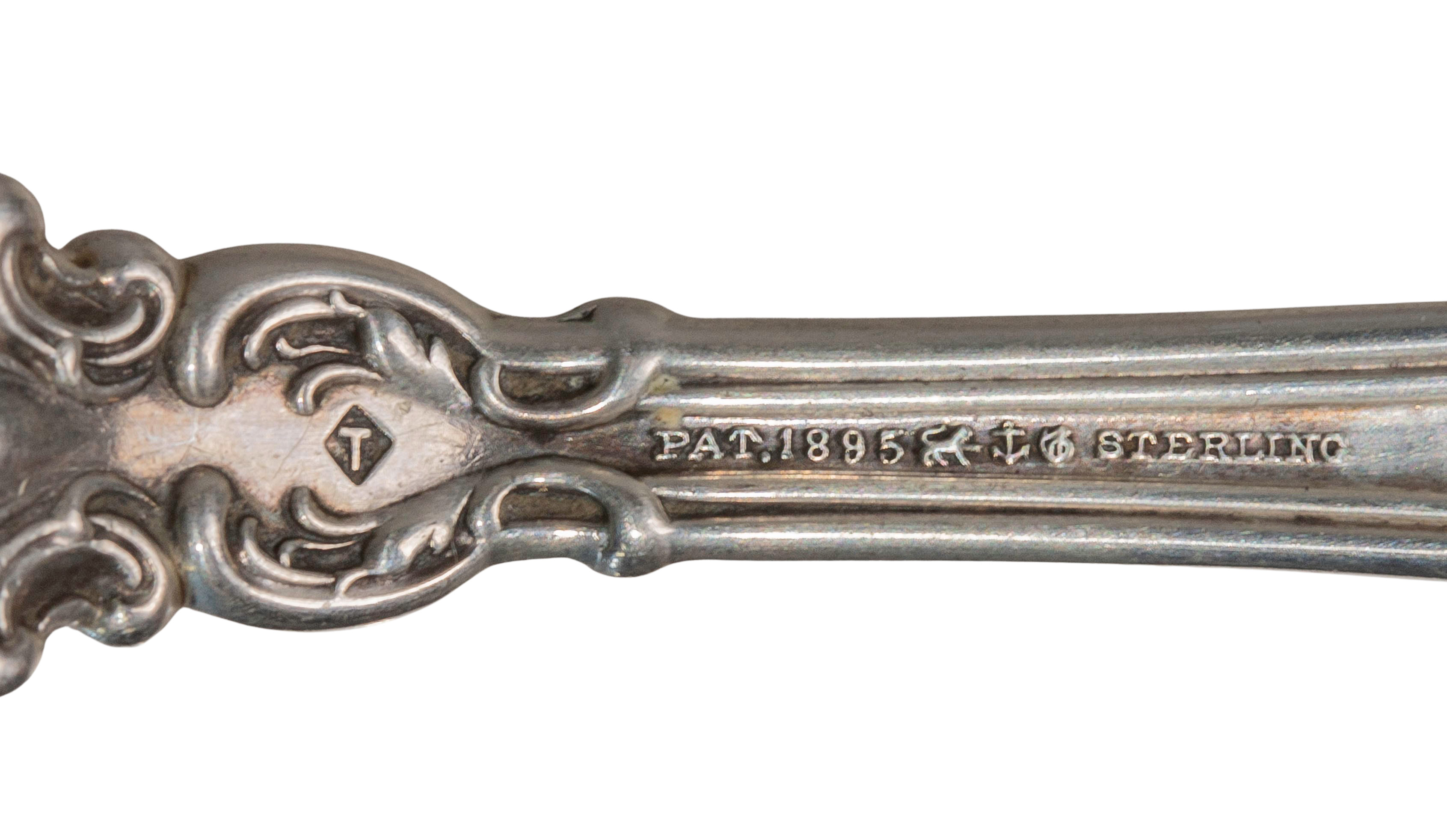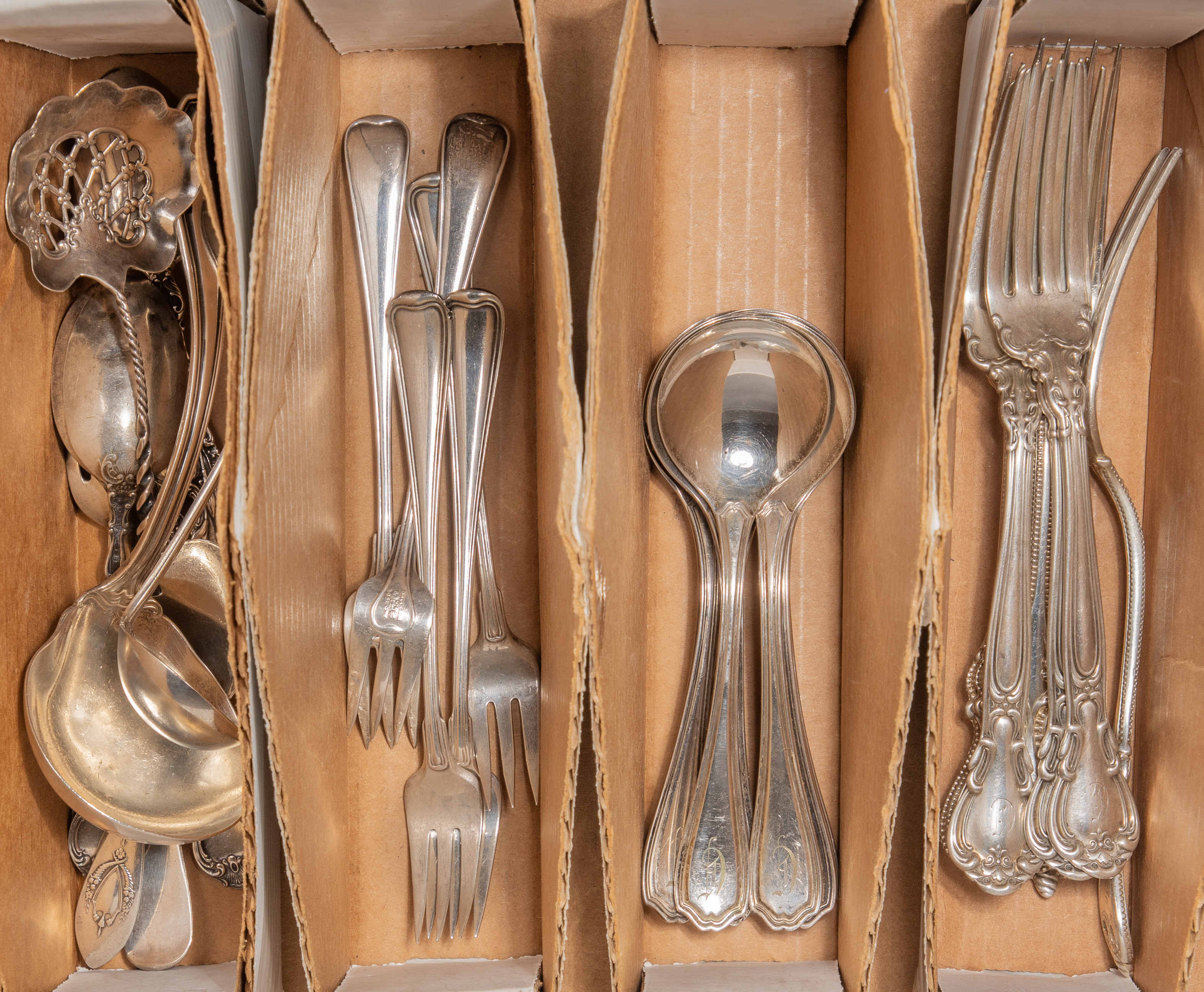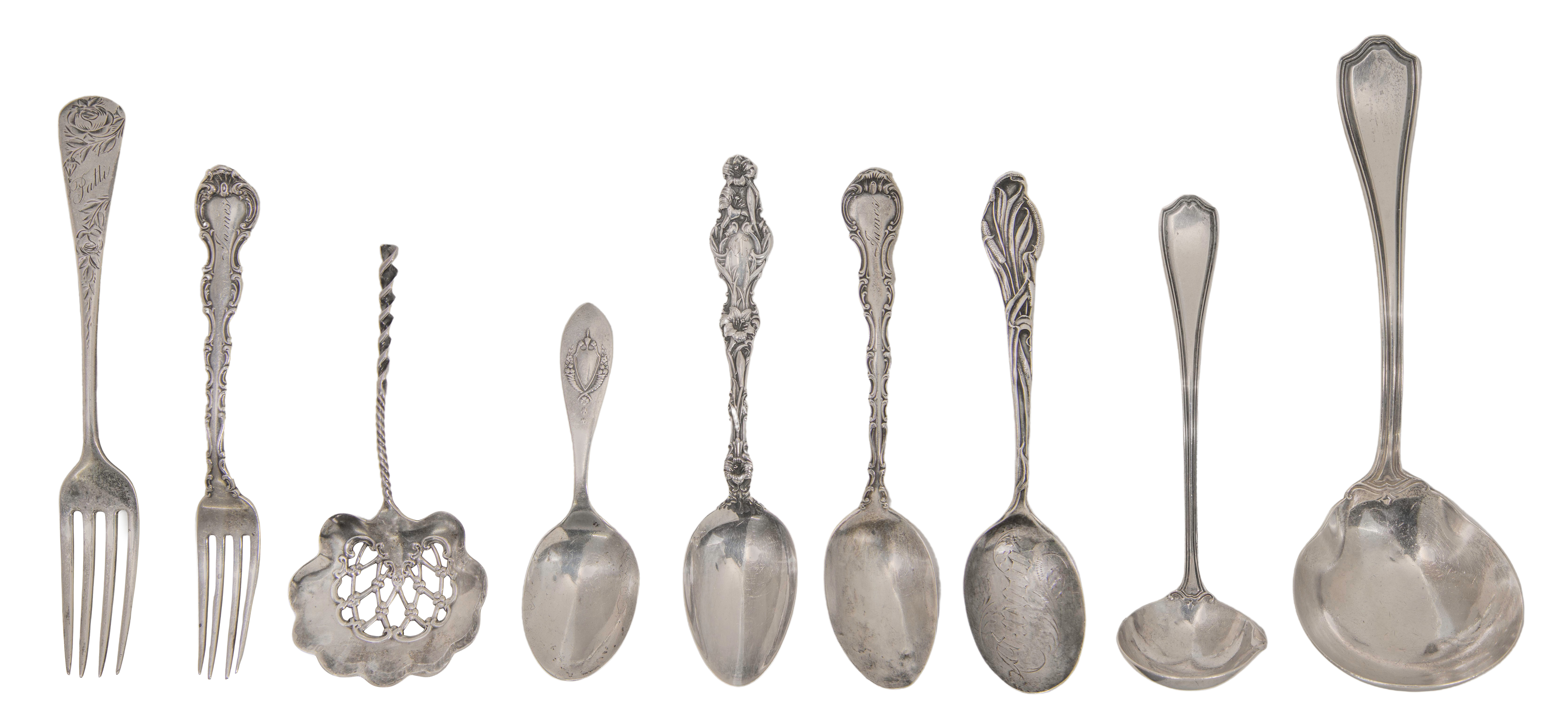 (35) items of various patterns including (9) 7-inch dinner forks, (5) 5 1/2-inch cocktail forks, (2) 5 1/4-inch youth forks, (12) 4 1/8-inch round soup spoons, (4) 5-inch youth spoons and (3) serving utensils (all marked 'sterling')