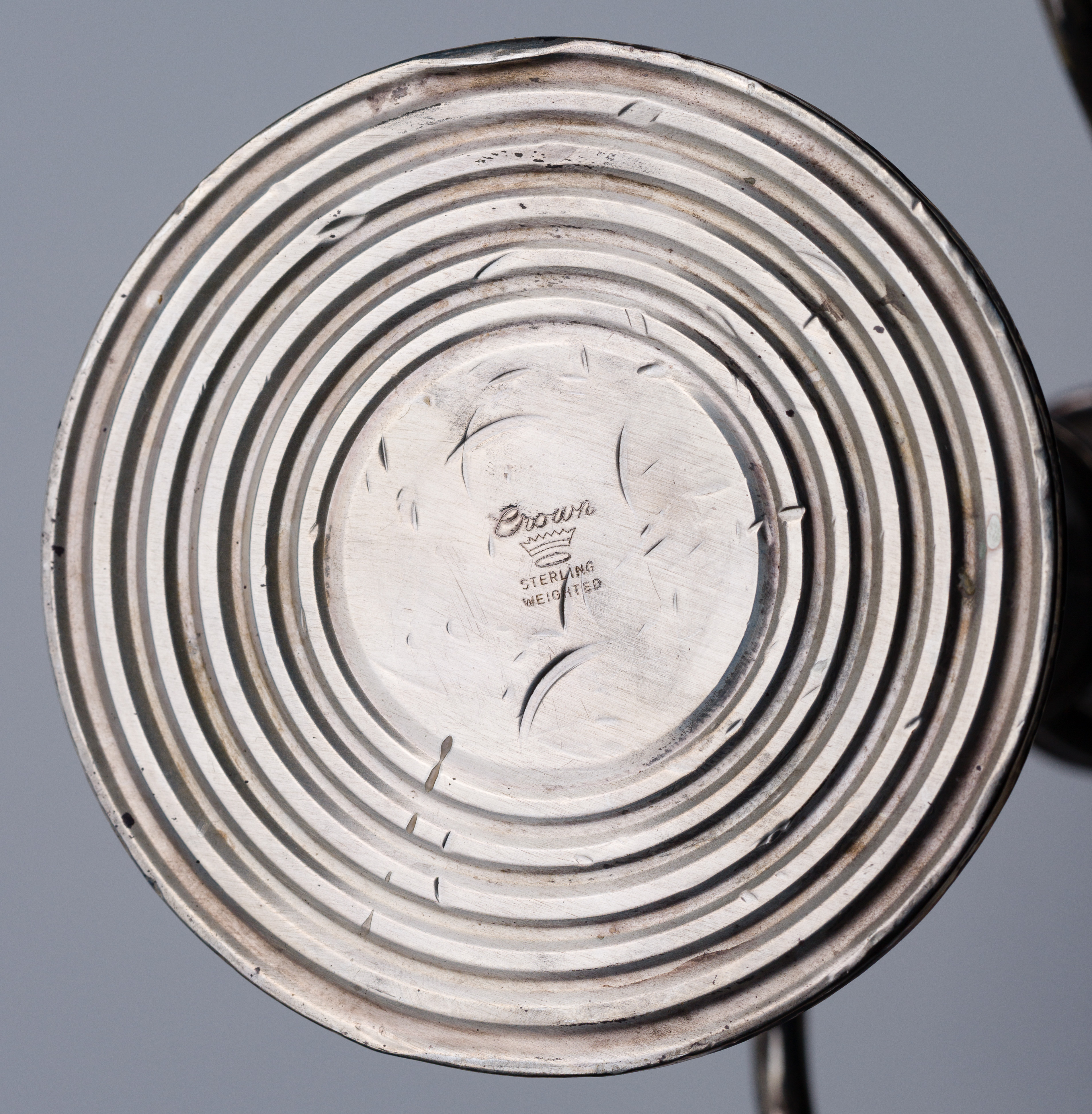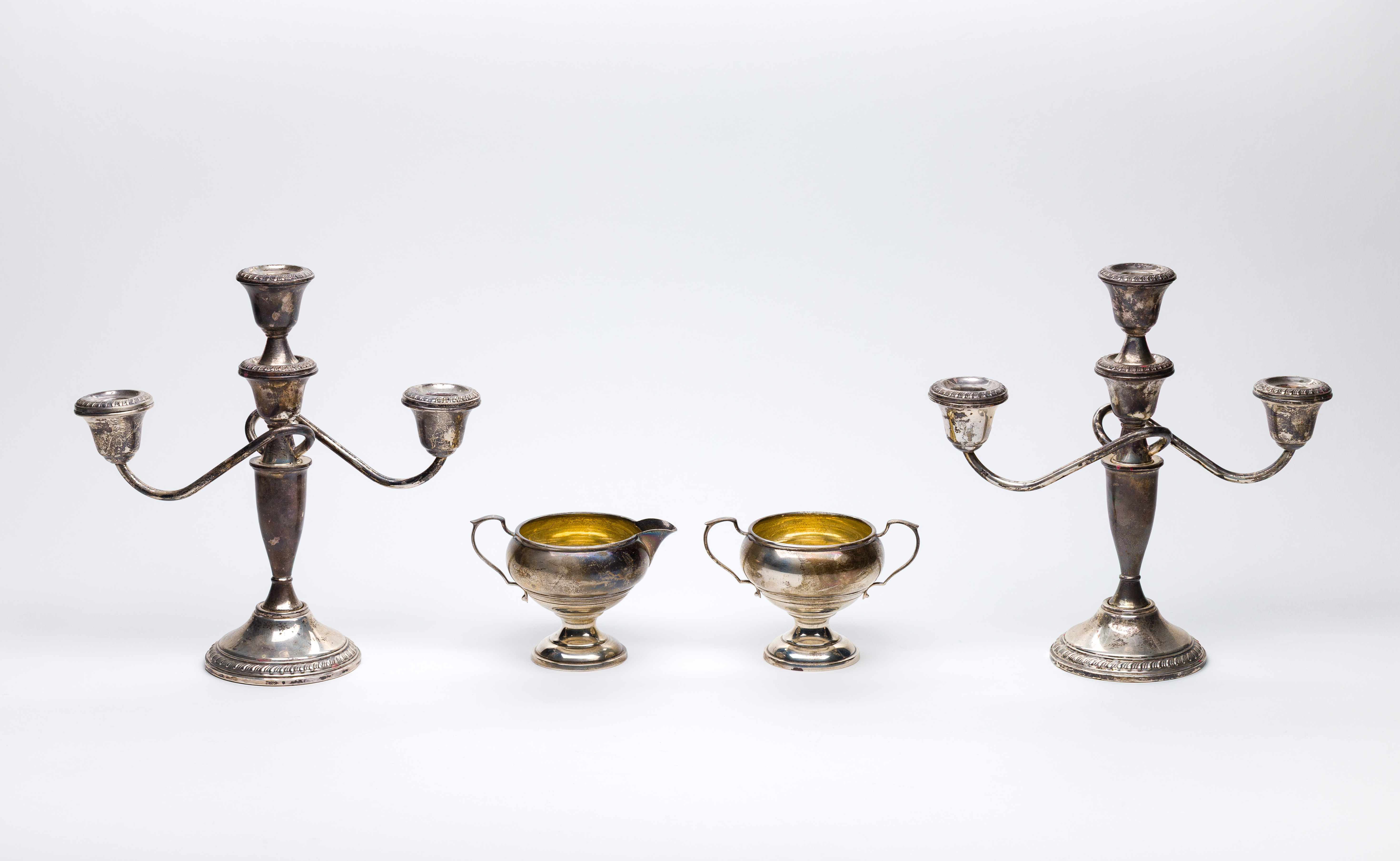 (4) items including Redlich cream and sugar bowl set and Crown weighted candelabra set (all marked 'sterling')