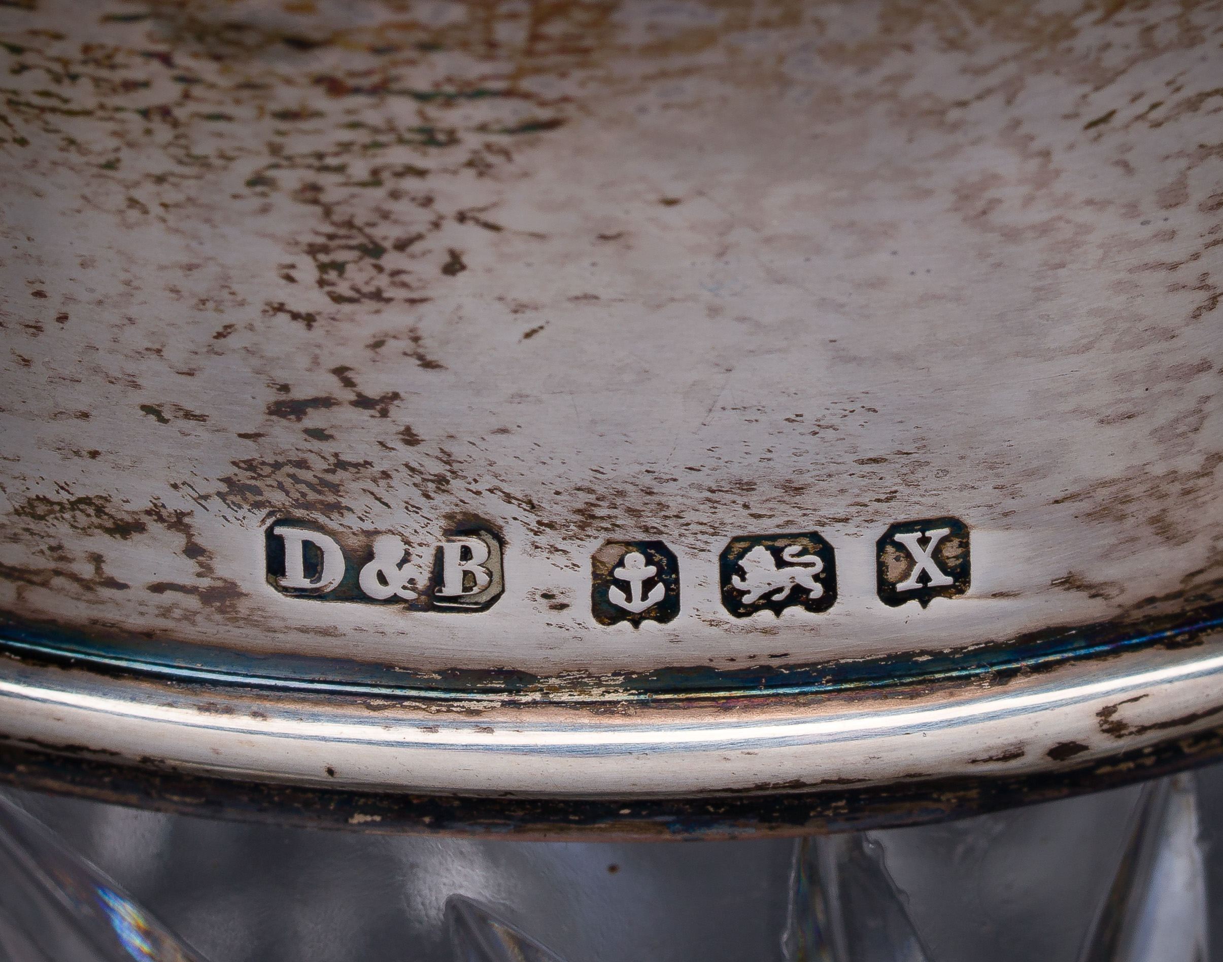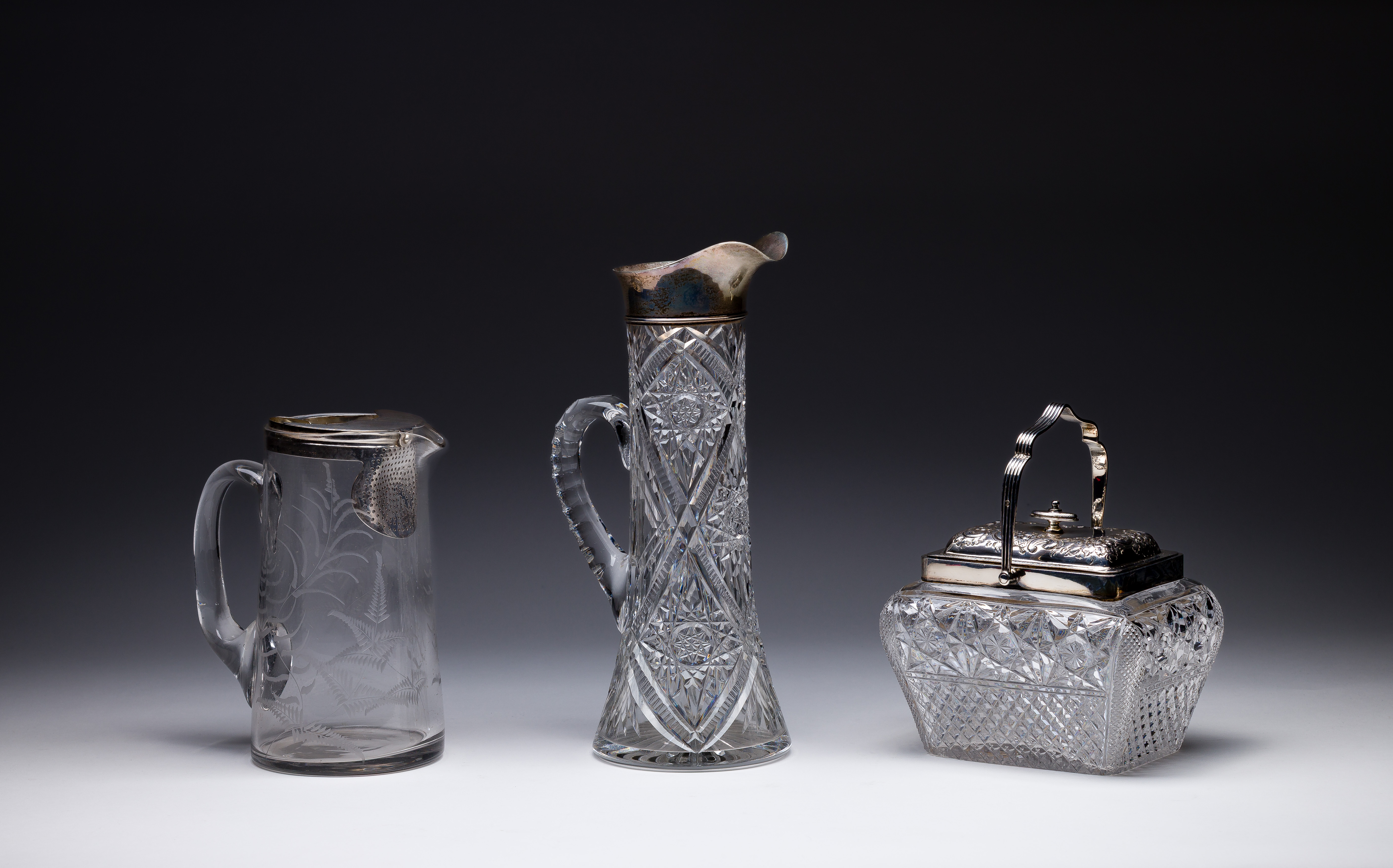 (3) items including a Docker & Bum cut glass ewer having Birmingham anchor and 'X' having serifs from 1872, a Charles Edward Nixon cut glass biscuit box having Sheffield crown and Gothic 'c' from 1895 and an Elkington & Co. Ltd etched glass pitcher having Birmingham anchor and 'f' having serifs from 1905 (all having lion passant and hallmarks to mounts)