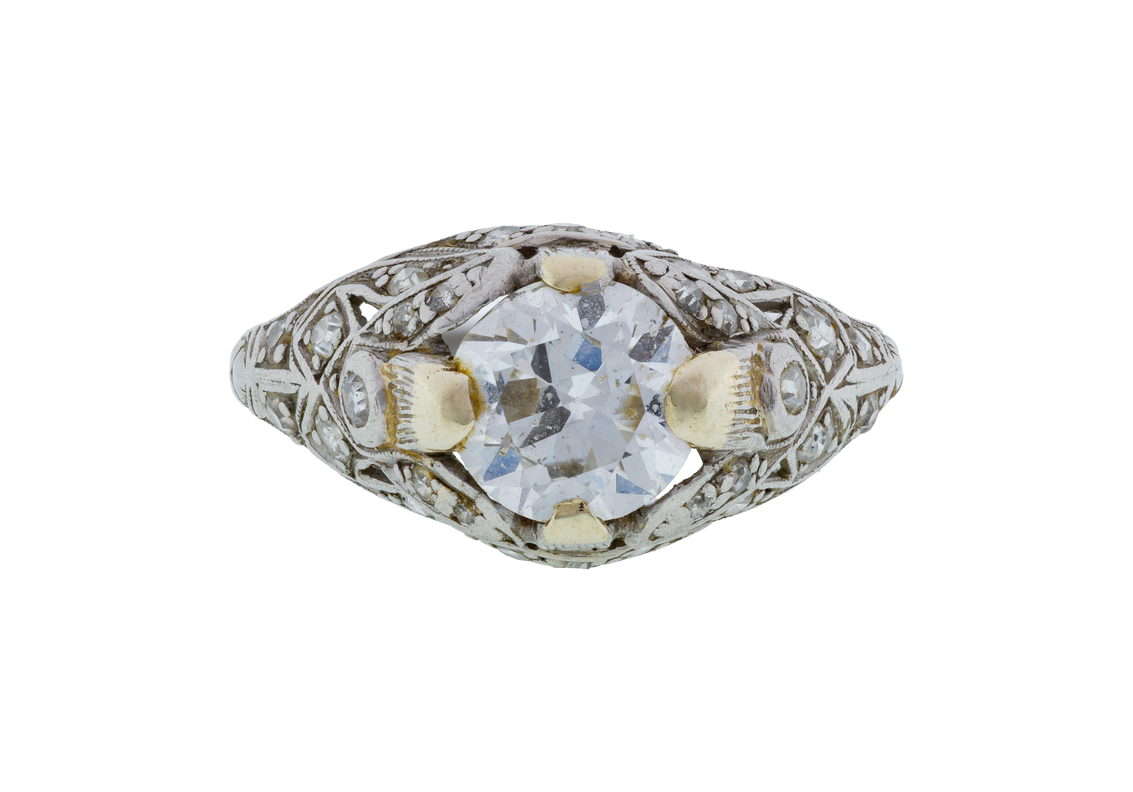 A dome style having a center diamond weighing approximately 1.05 carats, H/I color, SI-2 clarity, surrounded by twenty-four single cut diamonds weighing approximately 0.36 carat total, set in an open work setting (marked 'IRID.PLAT')