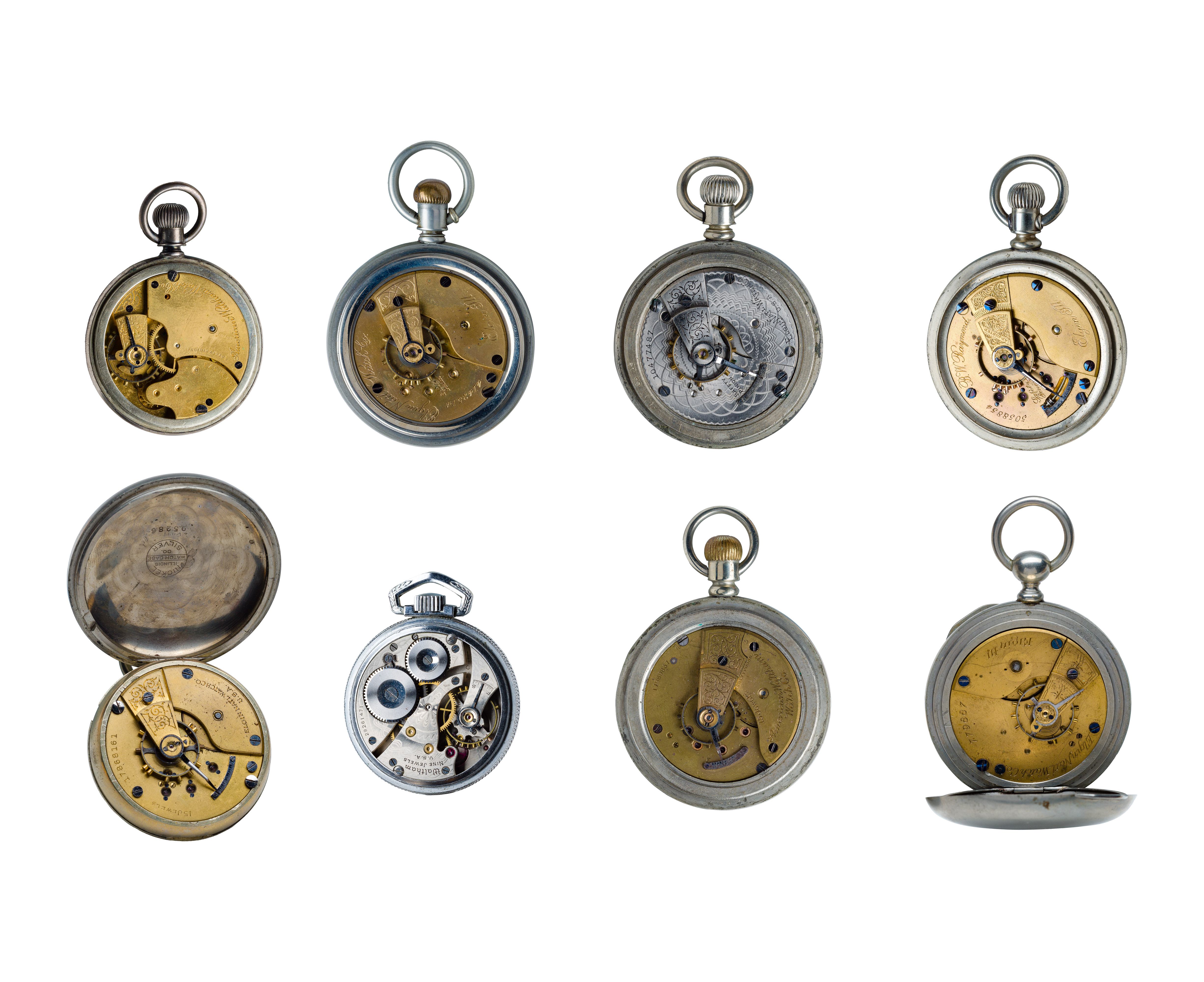 (8) items including and Elgin open face case movement #17868161 dating to 1914, 15-jewel movement, size 18S, 326, 106, white dial having Arabic numerals, blue hands, seconds sub-dial, pendant wind, lever set, American Waltham open face case movement #4921573 dating to 1891, size 14S, 1884, white dial having Roman numerals, blue hands, seconds sub-dial, pendant wind, pendant set, Waltham open face case movement #29261471 dating to 1937, size 16S, 1609, 1908, white dial having Arabic numerals, blue hands, seconds sub-dial, pendant wind, pendant set, Elgin open face case movement #779887 dating to 1881, size 18S, white dial having Arabic numerals, blue hands, key wind, key set, Elgin open face case movement #5058854 dating to 1894, 15-jewel movement, size 18S, 77, white dial having Roman numerals, blue hands, seconds sub-dial, pendant wind, pendant set, Elgin open face case movement #10477487 dating to 1904, size 18S, 208, 63, white dial having Arabic numerals, blue hands, seconds sub-dial, pendant wind, pendant set, Waltham open face case movement #17989837 dating to 1910, 15-jewel movement, size 18S, 81, 1883, white dial having Roman numerals, blue hands, seconds sub-dial, pendant wind, pendant set, Elgin open face case movement #4142514 dating to 1891, size 18S, 73, 11, white dial having Roman numerals, blue hands, seconds sub-dial, pendant wind, pendant set