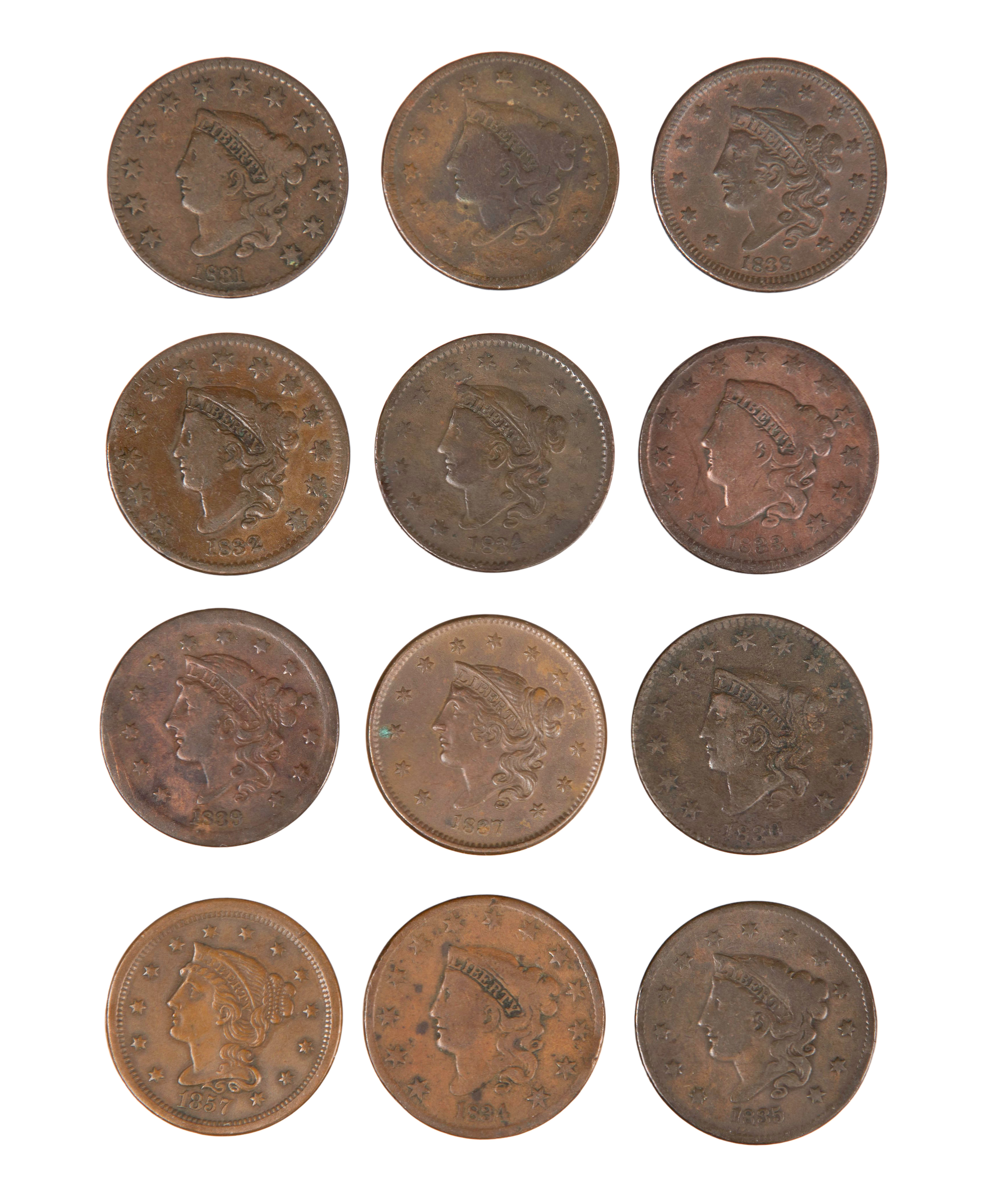 (12) coins including 1830, 1831, 1832, 1833, (2) 1834, 1835, 1836, 1837, 1838, 1839 and 1857