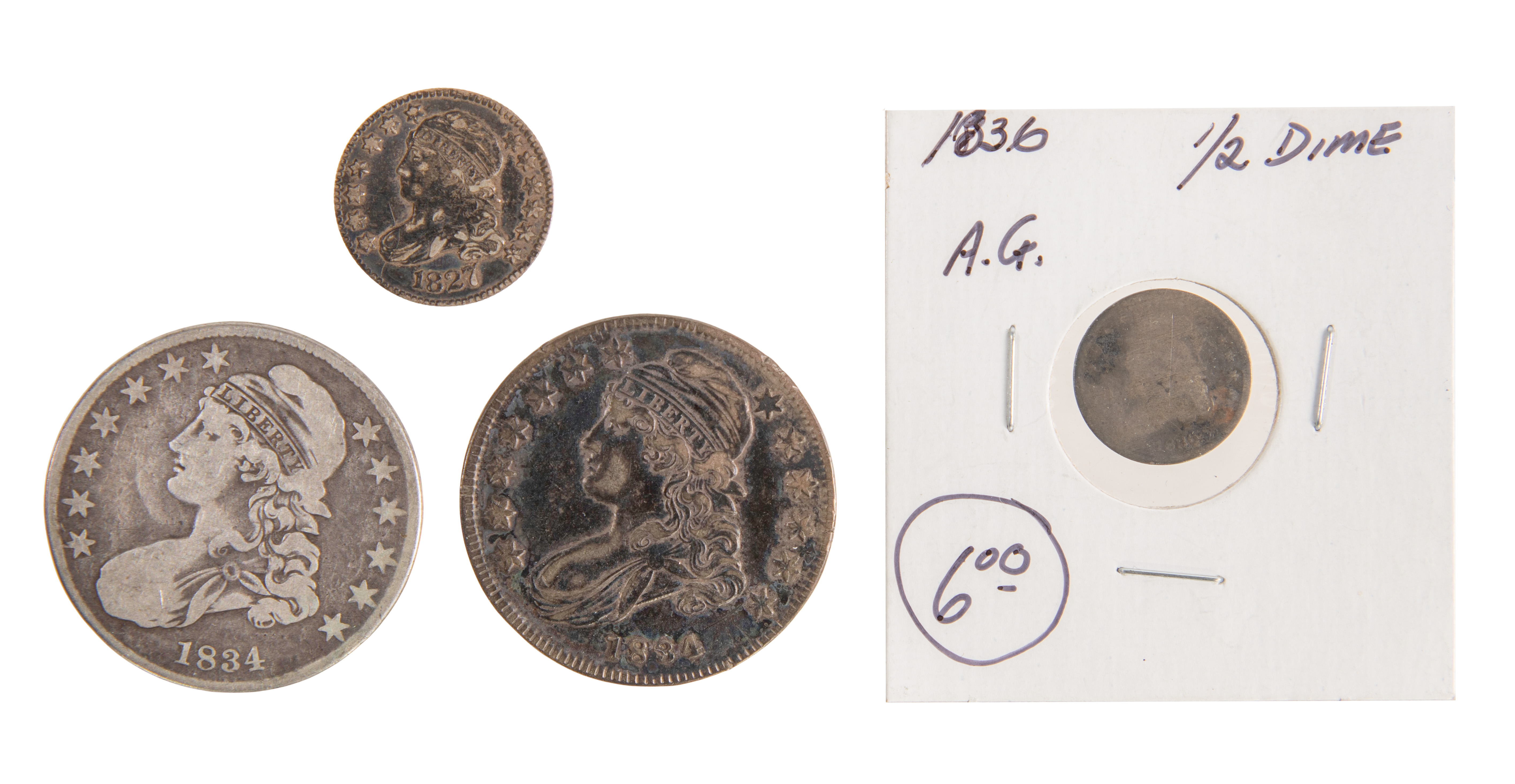 (4) coins including (2) 1834 50c, a 1827 10c and an 1836 half dime