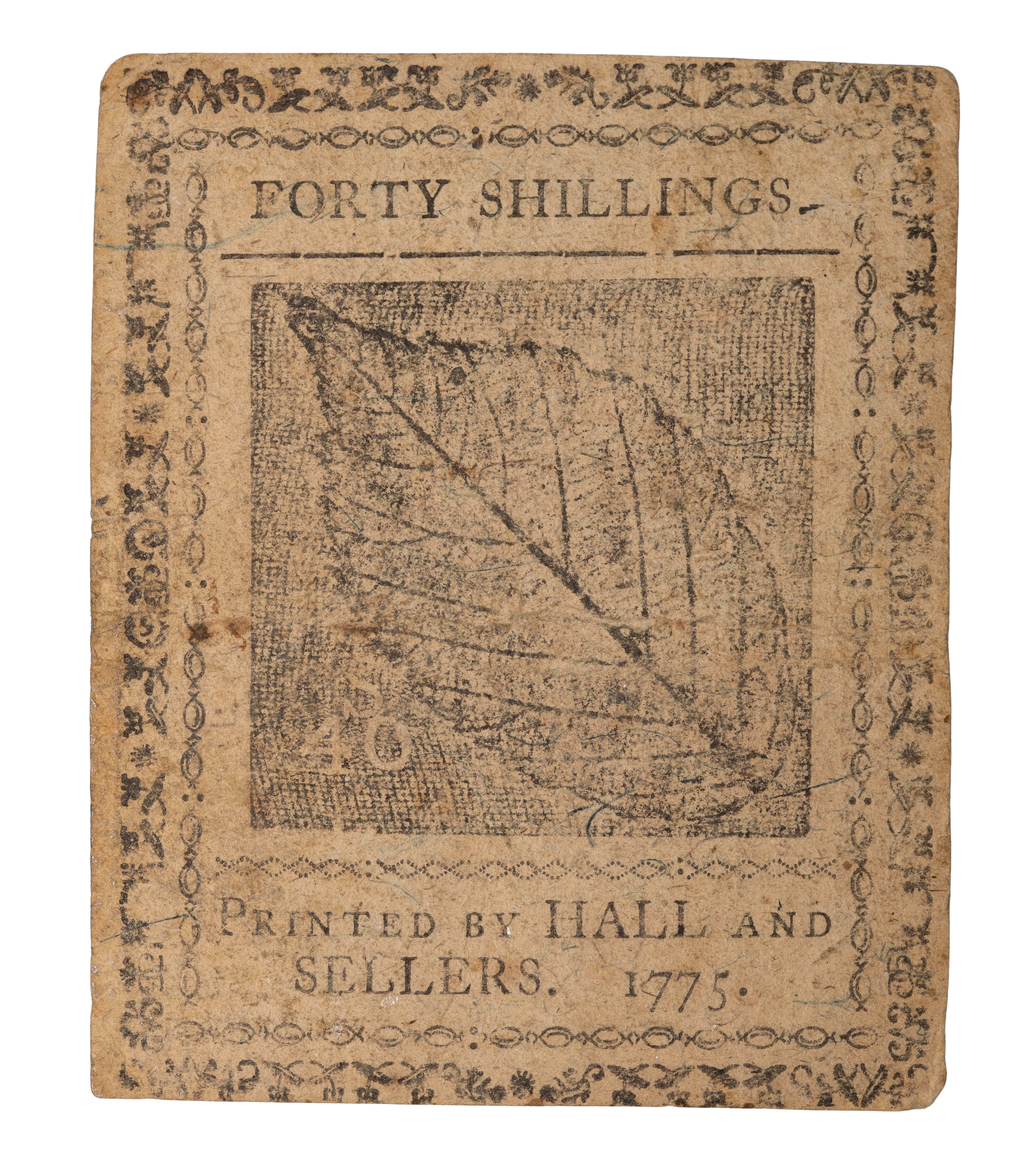A Forty Shillings banknote from the colonial era, specifically printed in 1775 by the firm of Hall and Sellers in Pennsylvania